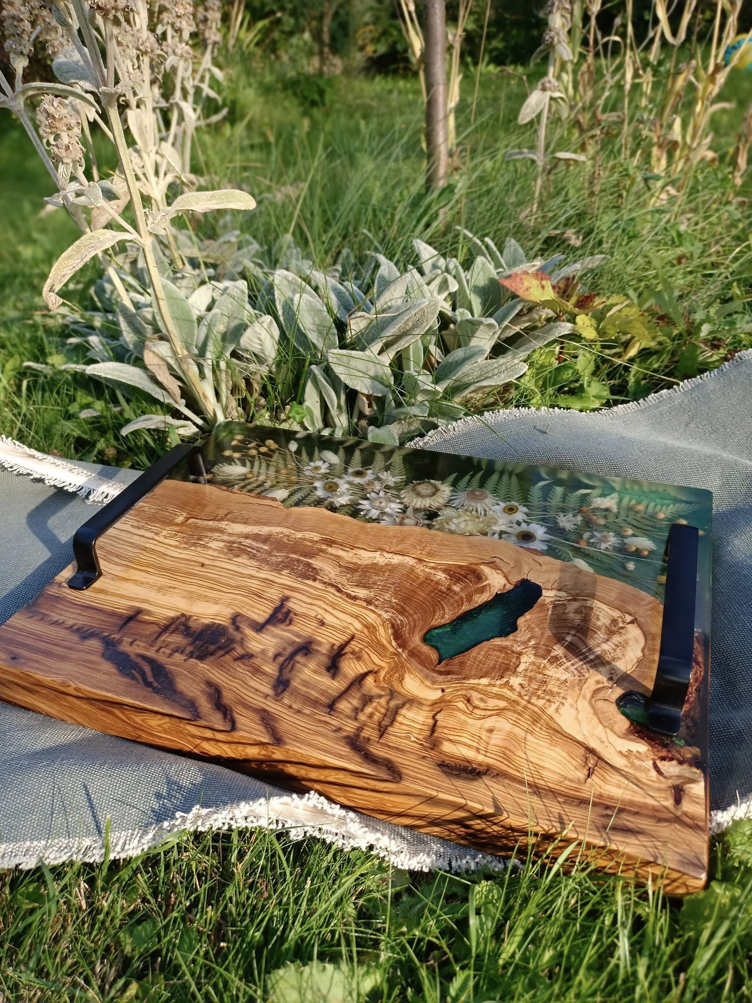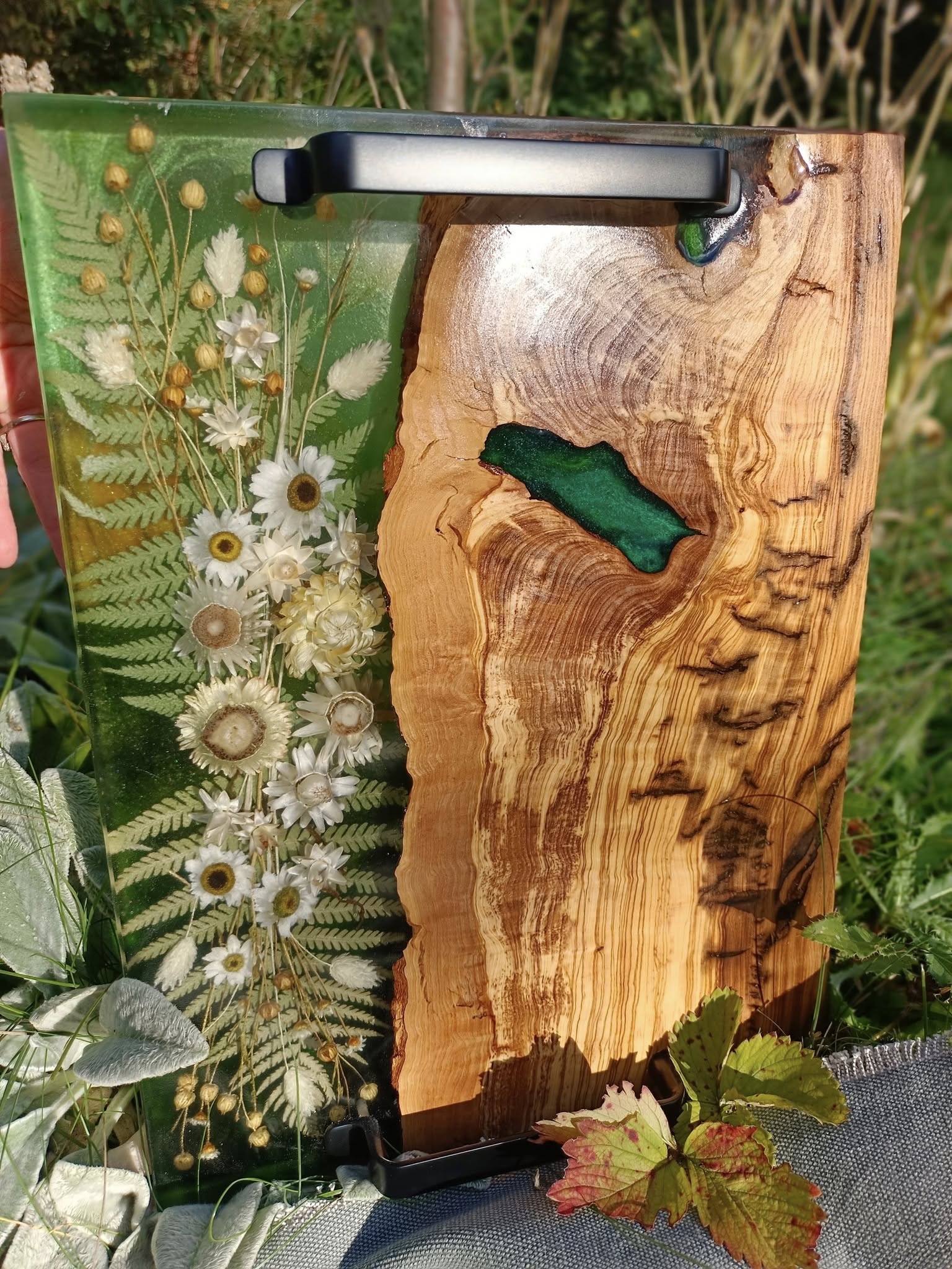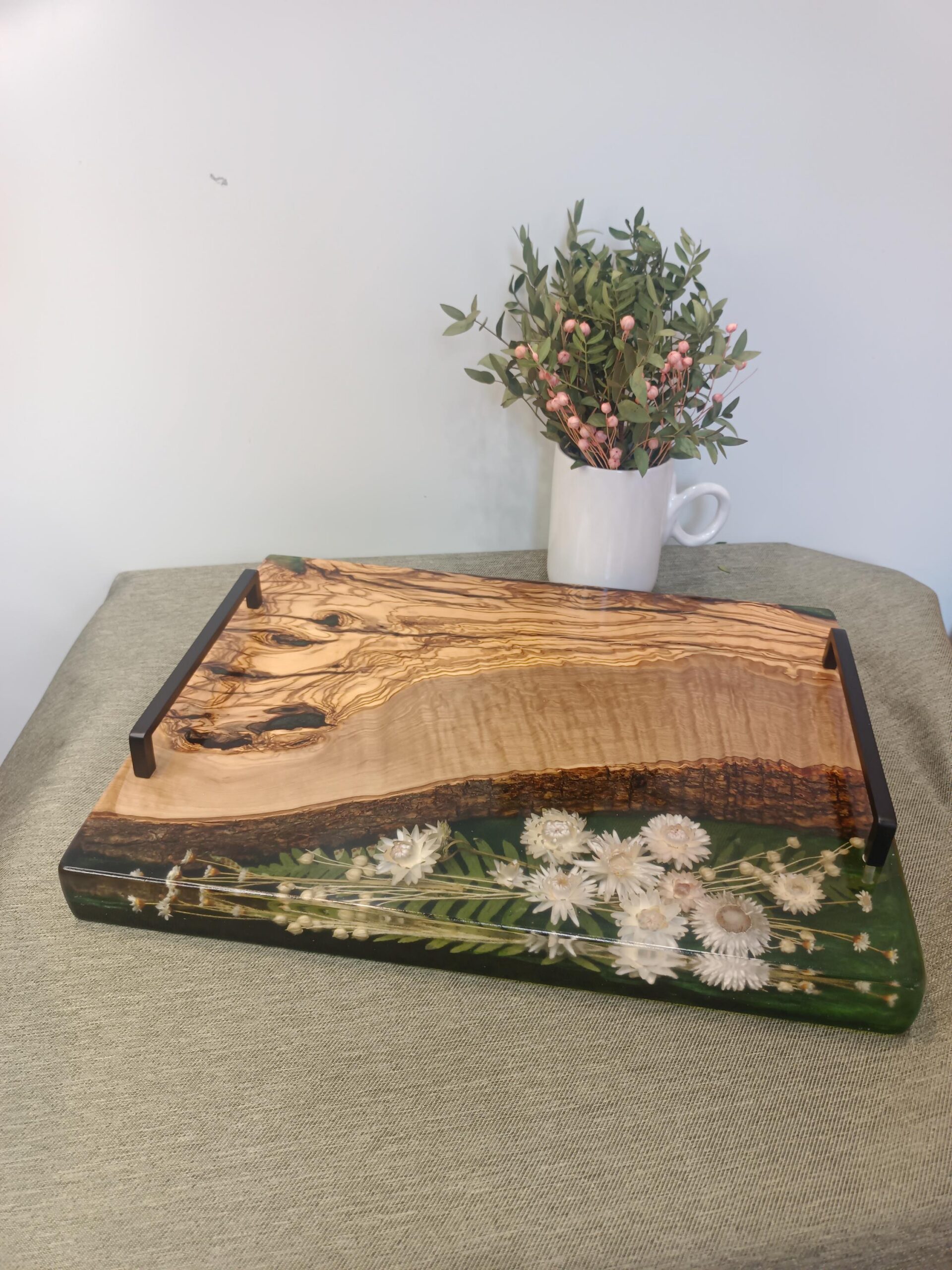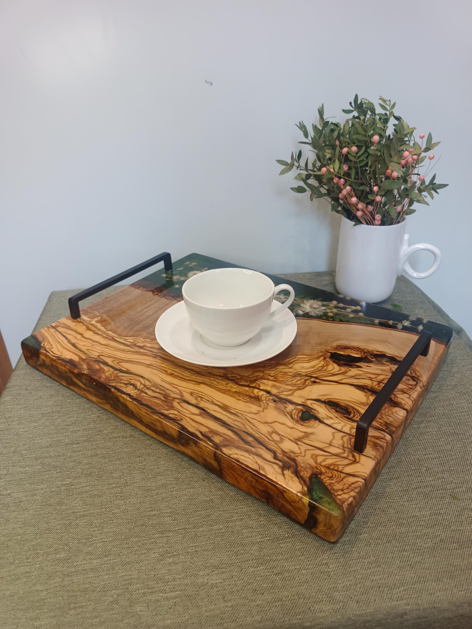 Wprowadź naturę do swojego domu w najbardziej eleganckiej formie. Ta ręcznie wykonana taca z drewna oliwnego to mariaż surowej siły natury i delikatności polnych kwiatów. Połączenie głębokiej, zielonej żywicy z ciepłym usłojeniem oliwki tworzy niepowtarzalny obraz, który ożywi każde wnętrze.