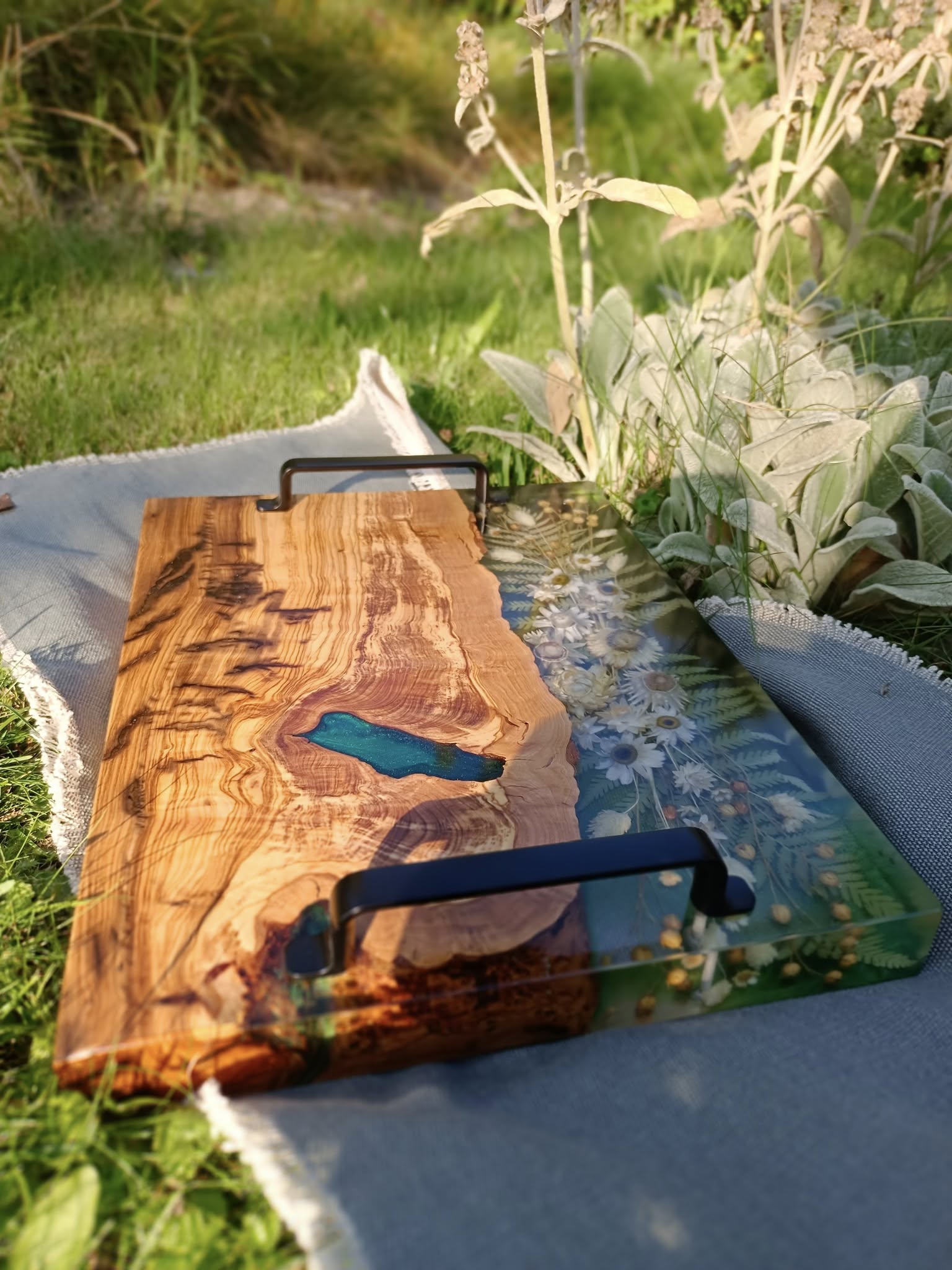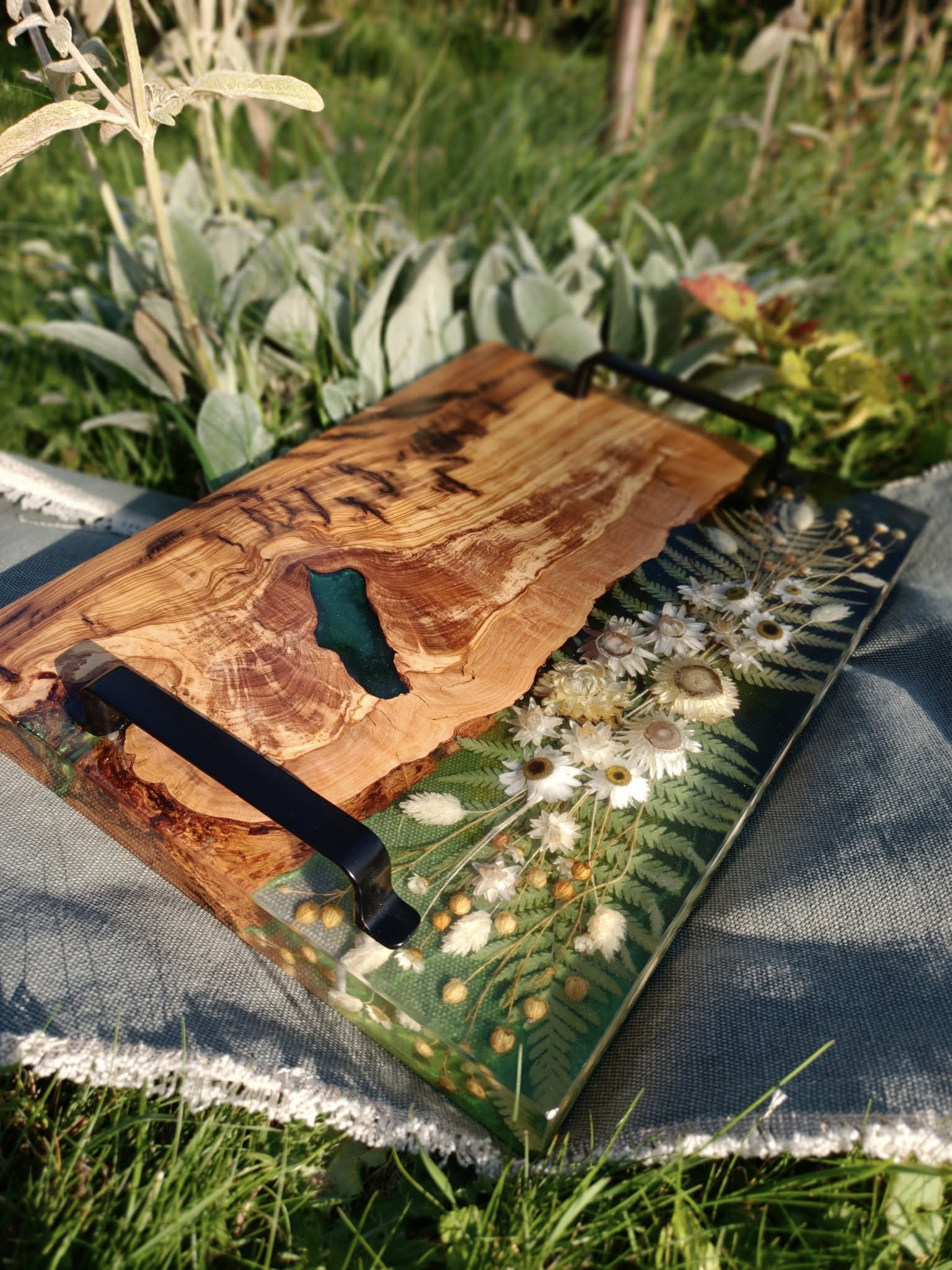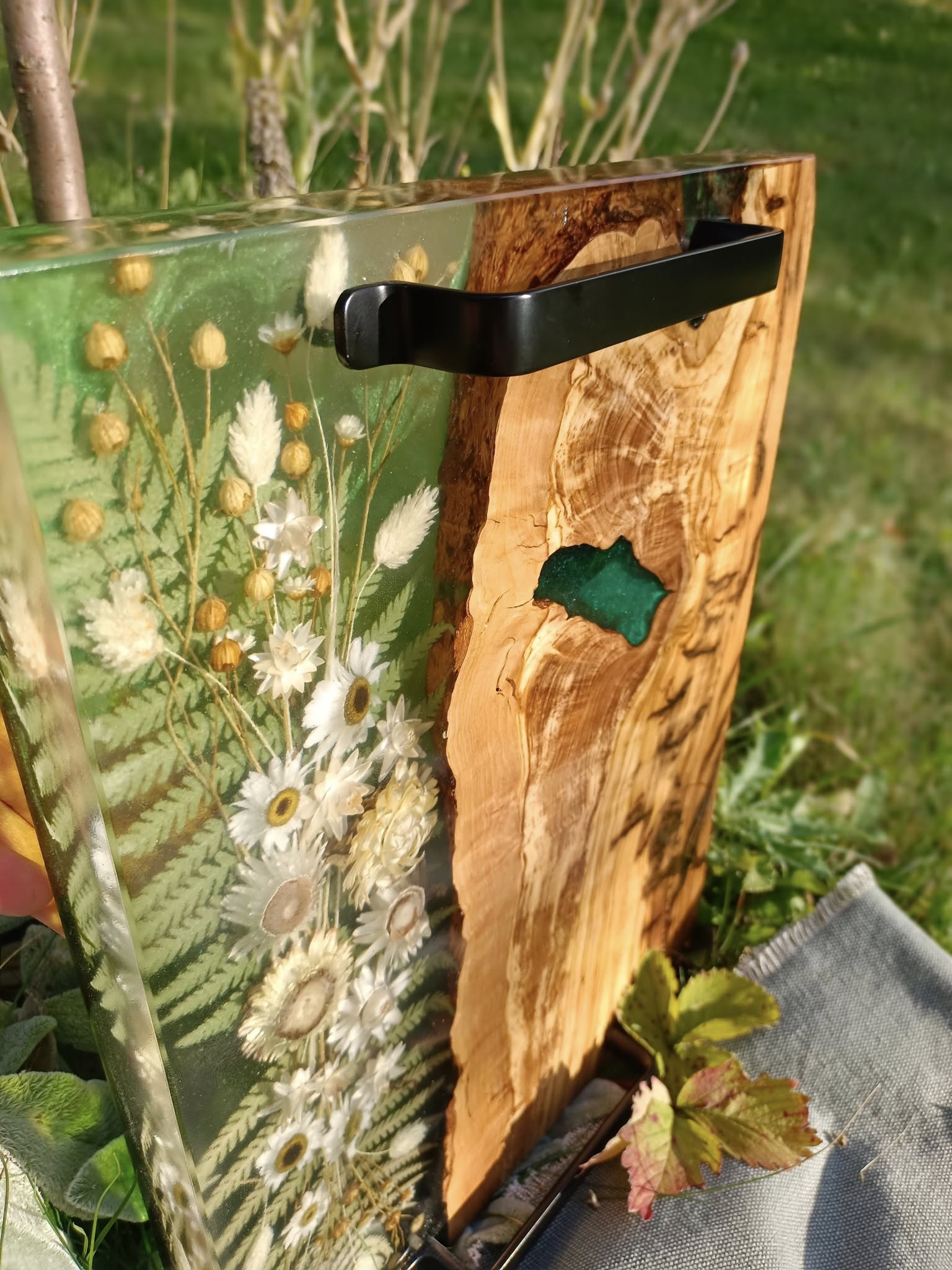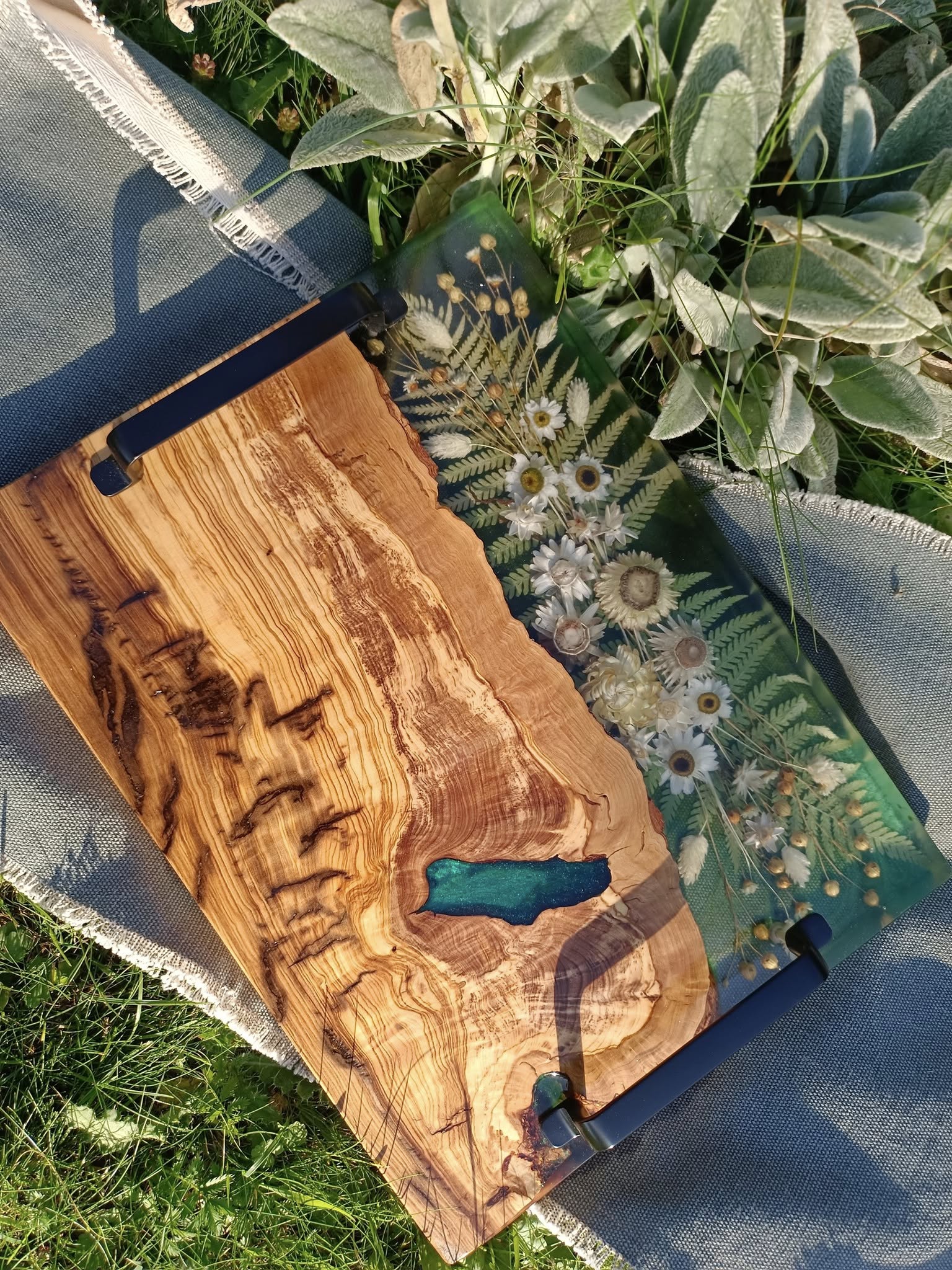 Wprowadź naturę do swojego domu w najbardziej eleganckiej formie. Ta ręcznie wykonana taca z drewna oliwnego to mariaż surowej siły natury i delikatności polnych kwiatów. Połączenie głębokiej, zielonej żywicy z ciepłym usłojeniem oliwki tworzy niepowtarzalny obraz, który ożywi każde wnętrze.