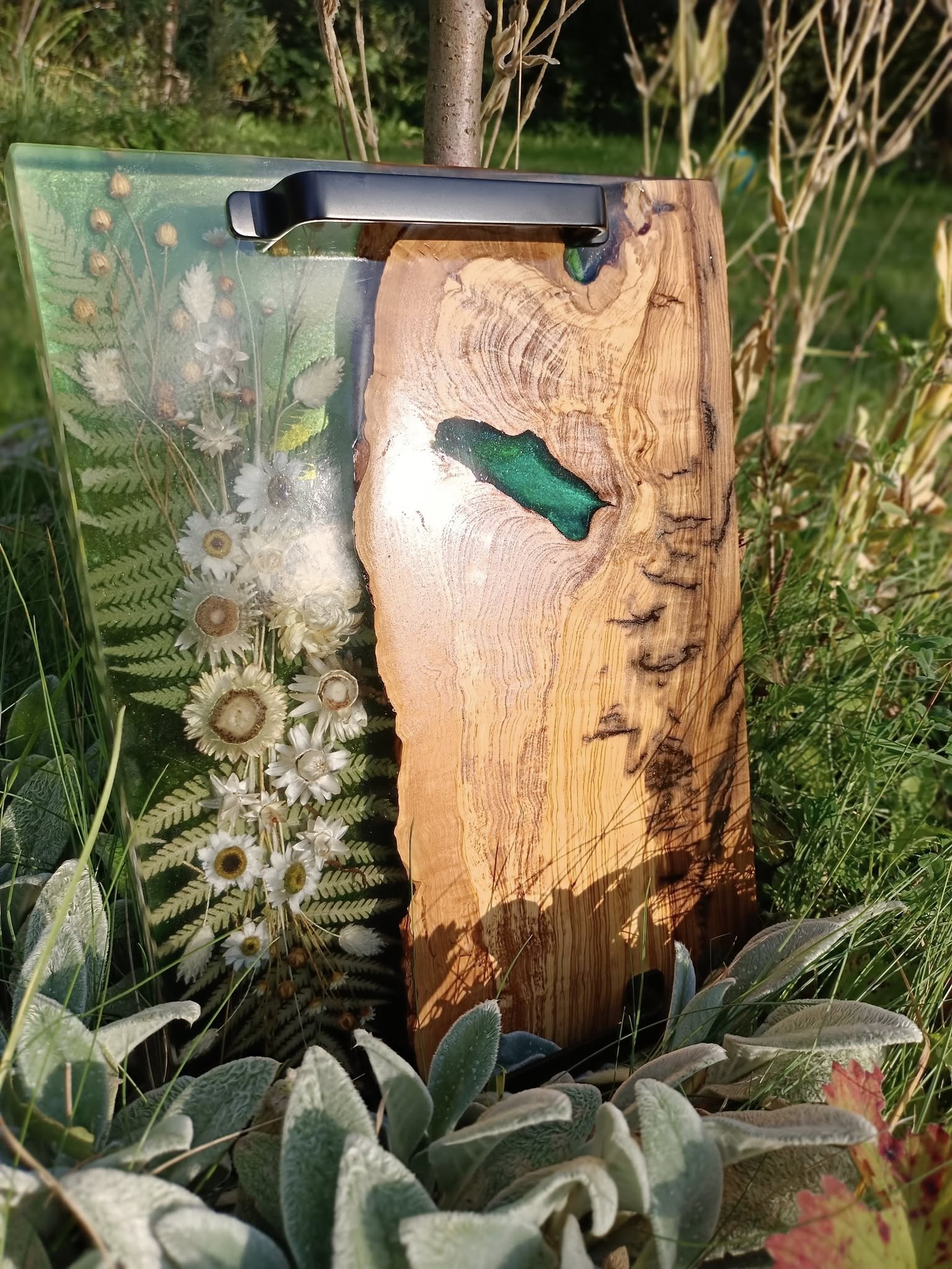Materiał: Drewno oliwne, żywica epoksydowa, suszone rośliny.