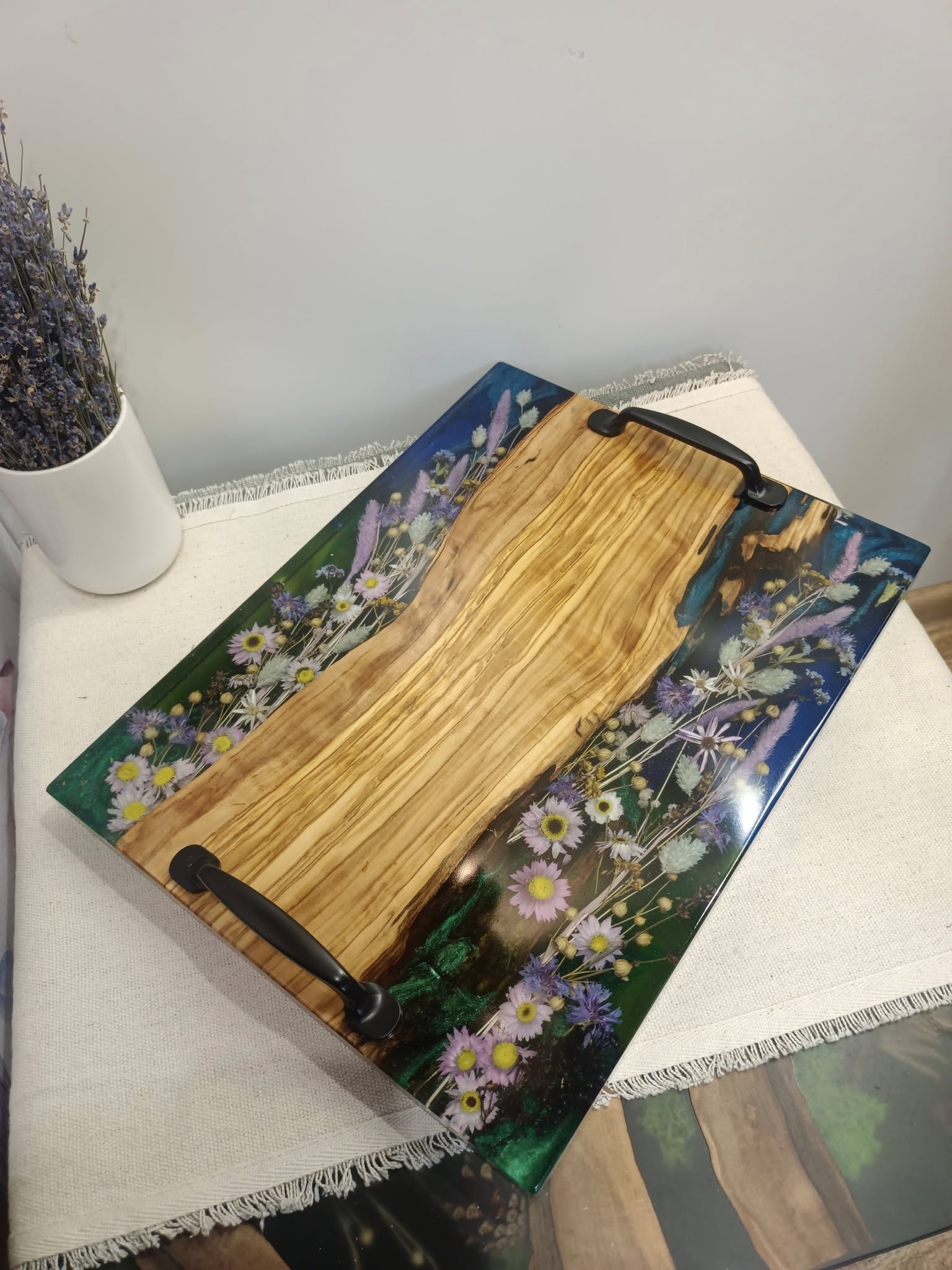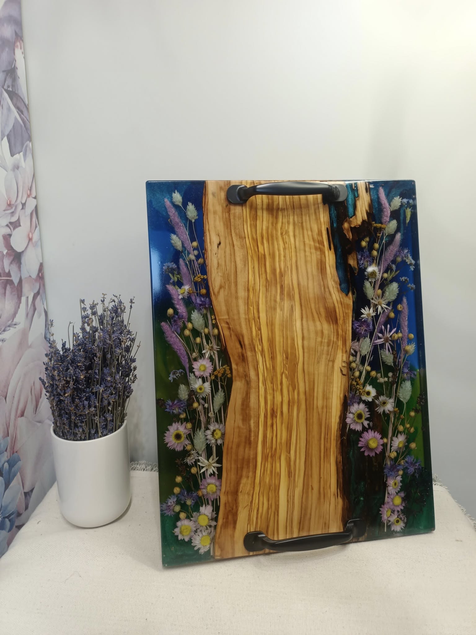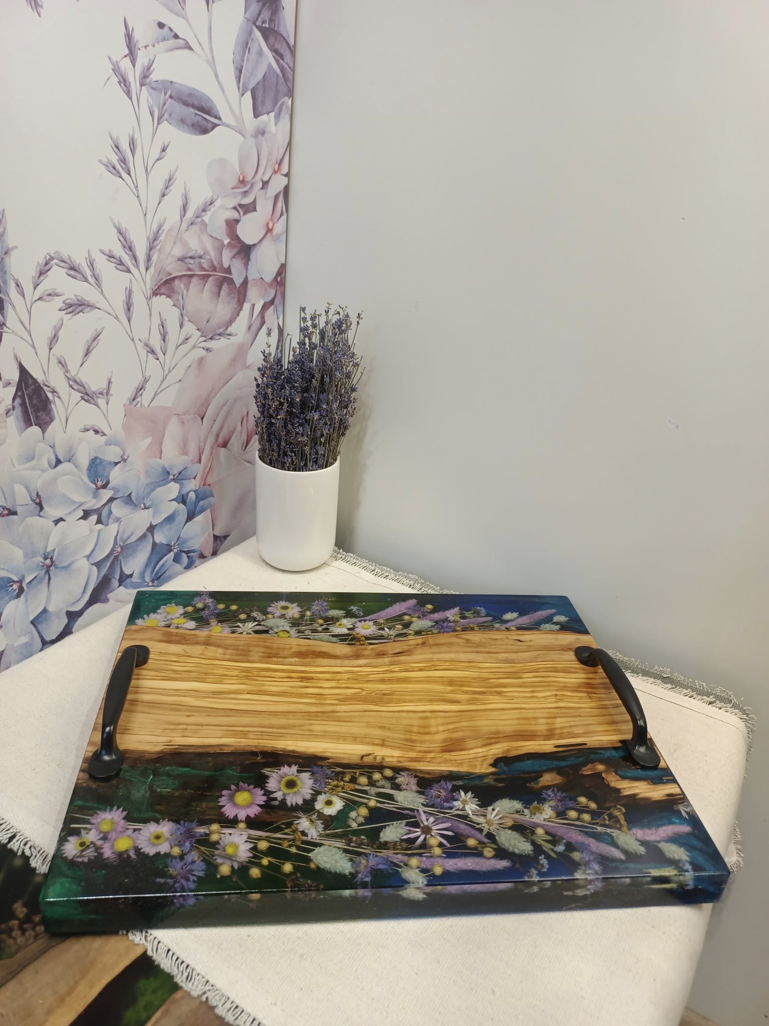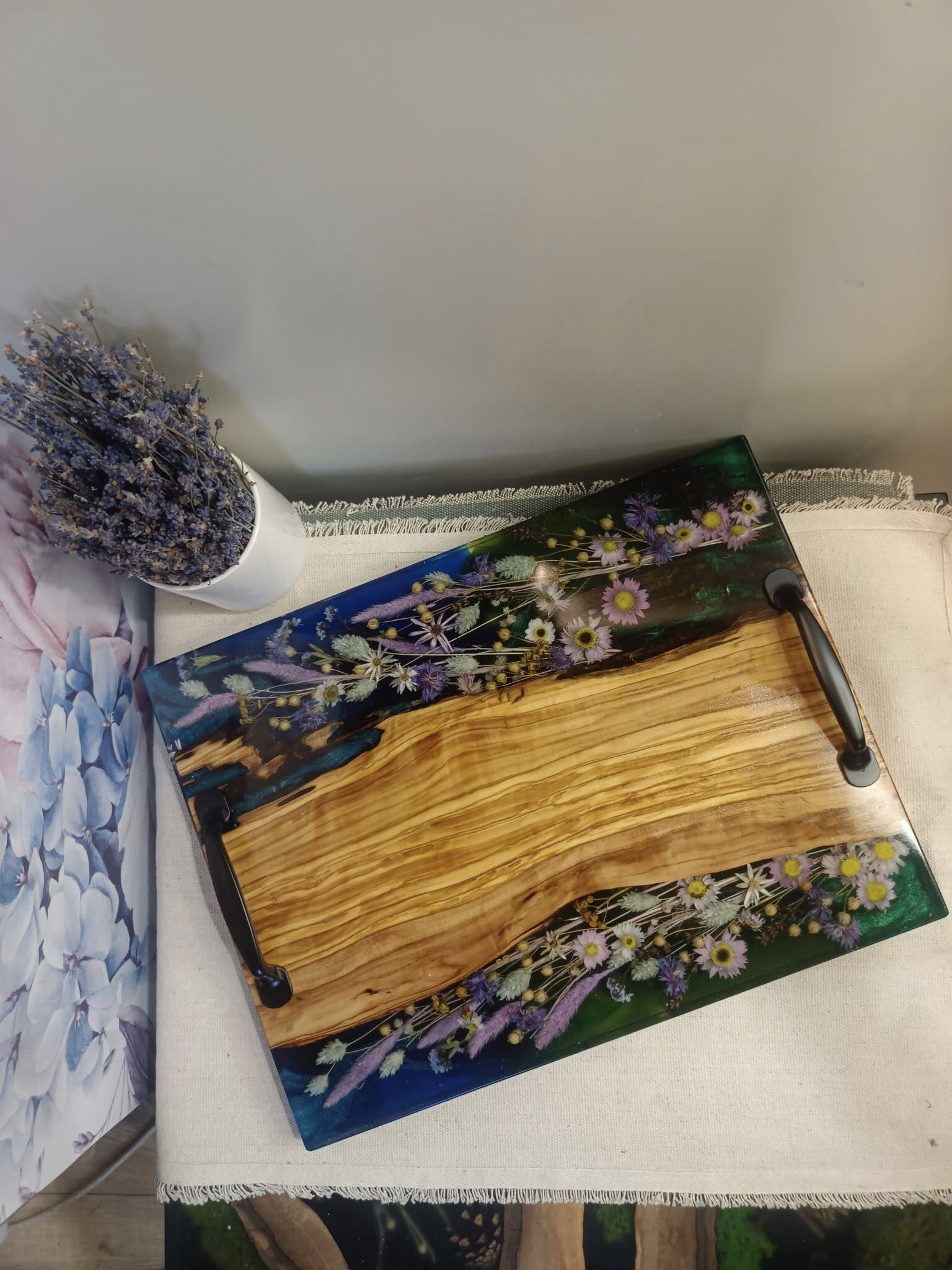 Materiał: Drewno oliwne, żywica epoksydowa, suszone rośliny, metalowe uchwyty.