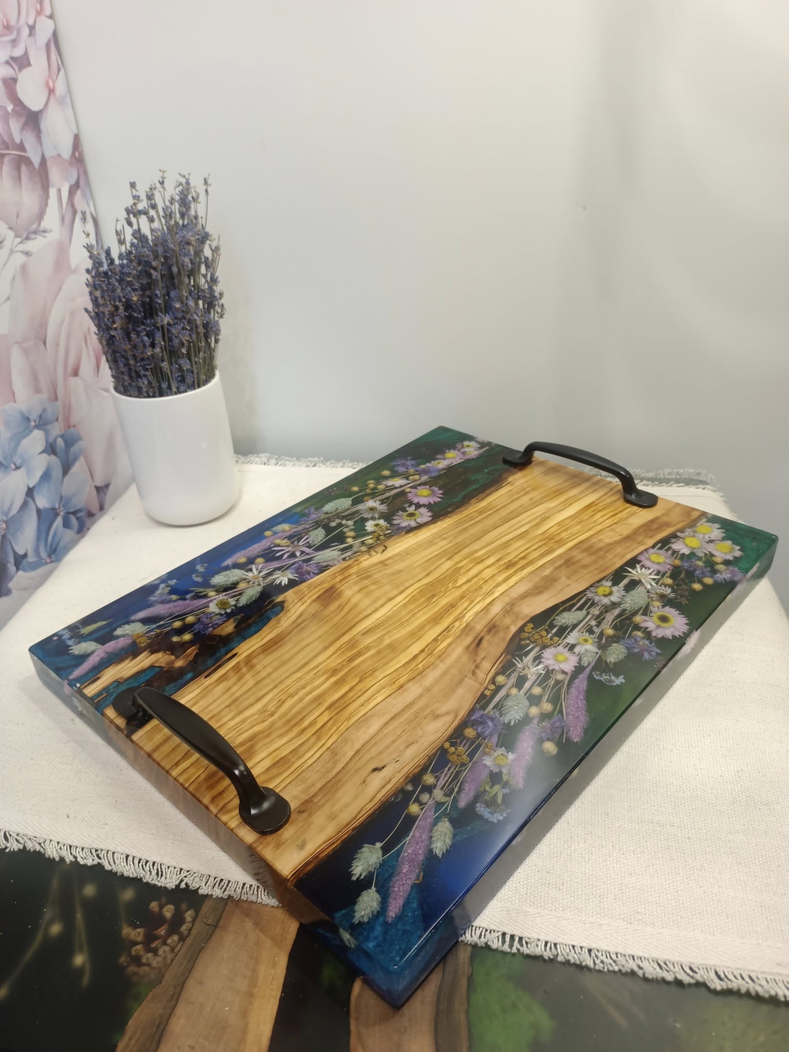 Zatrzymaj urok dzikiej przyrody w swoim domu. Ta ręcznie wykonana taca z drewna oliwnego to hołd dla natury, łączący surowość starego drzewa z eterycznym pięknem polnych roślin. Głęboka, niebiesko-zielona żywica tworzy efektowne tło dla delikatnych kłosów i białych kwiatów, nadając całości niemal magicznego charakteru.