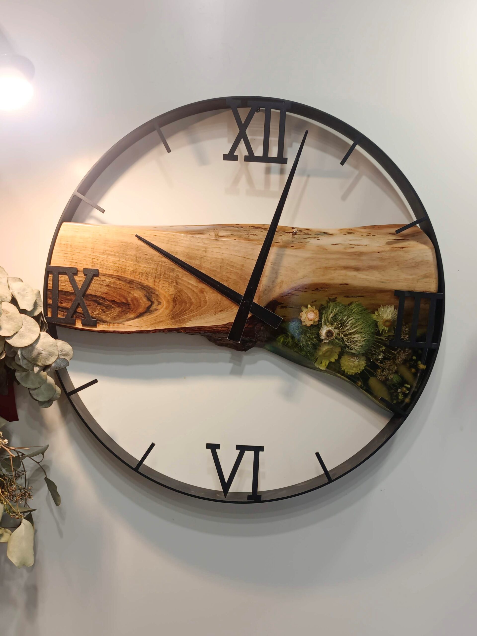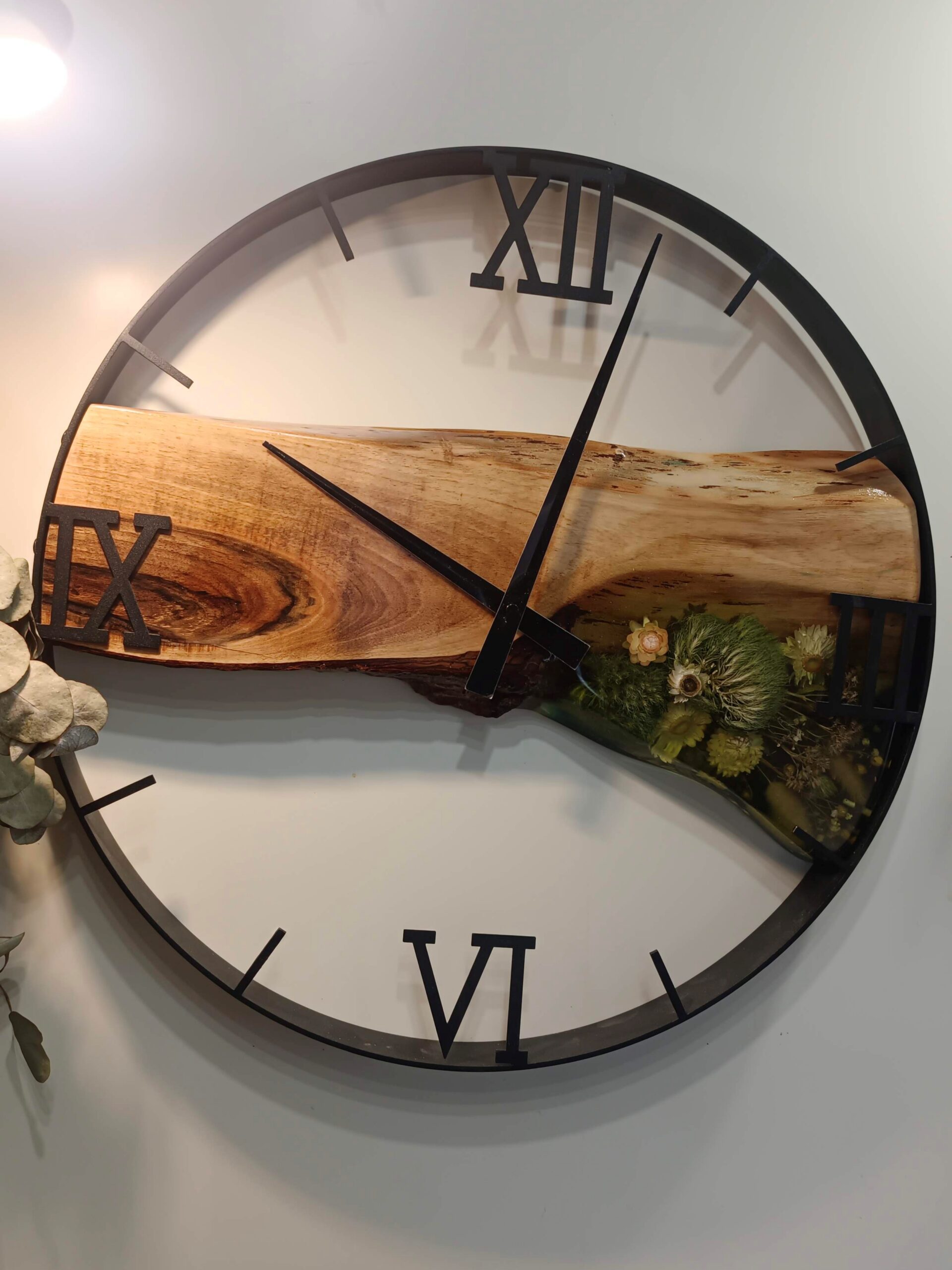 Surowość loftu przełamana oddechem natury. Ten wielkoformatowy zegar o średnicy 50 cm to unikatowe połączenie industrialnego designu z leśnym spokojem. Został stworzony dla wnętrz z charakterem – nowoczesnych apartamentów, surowych biur czy salonów w stylu modern industrial.