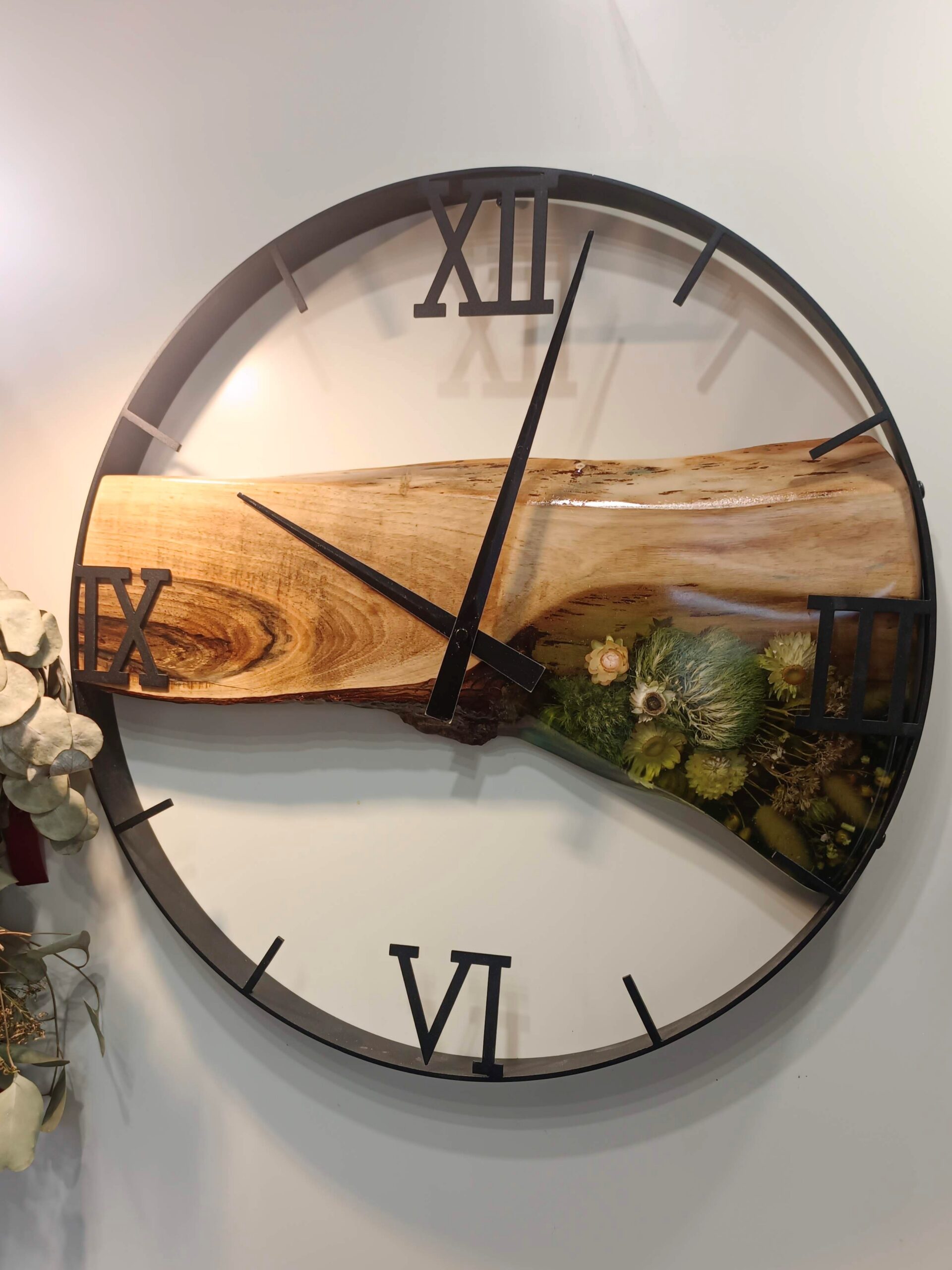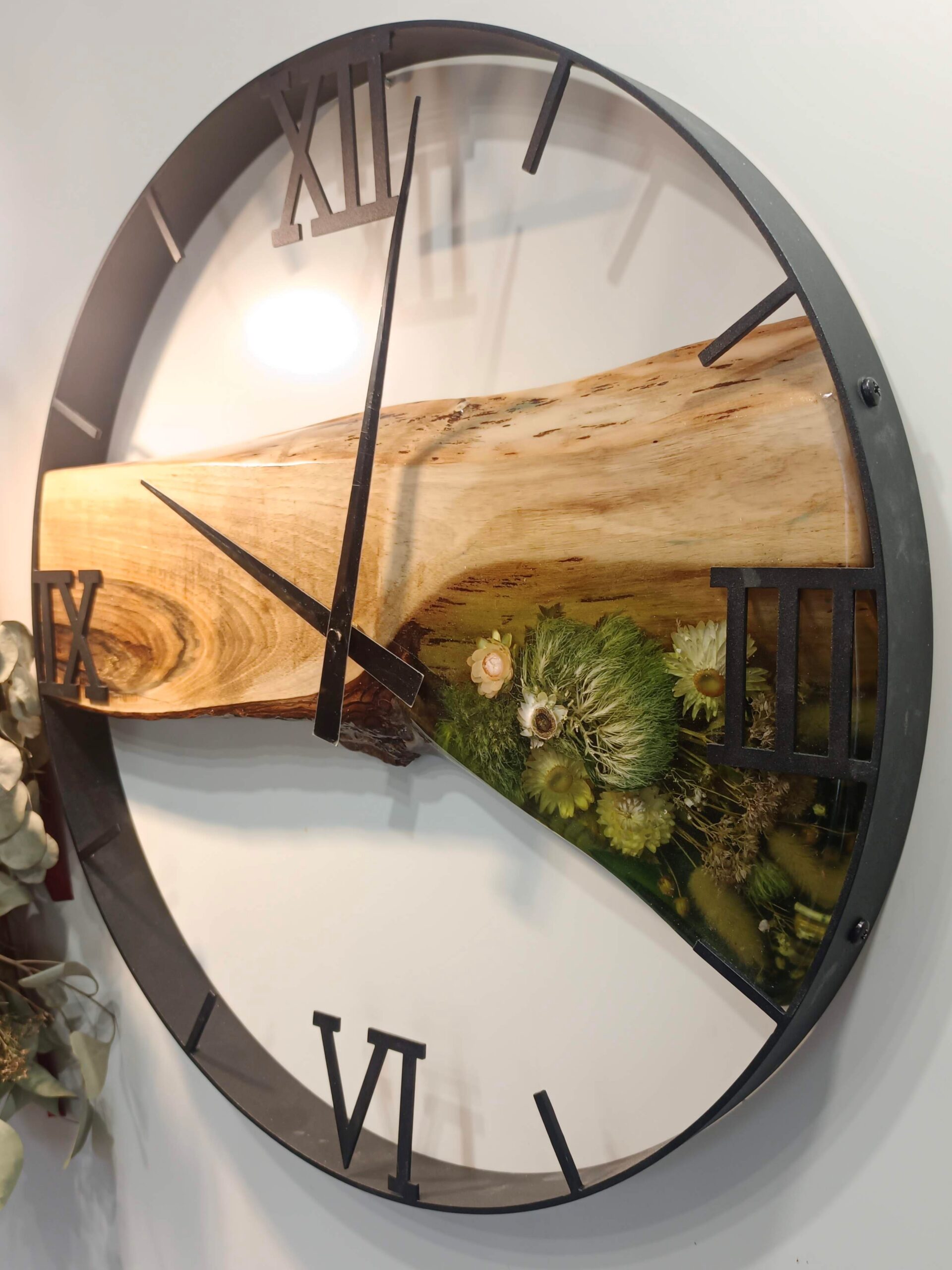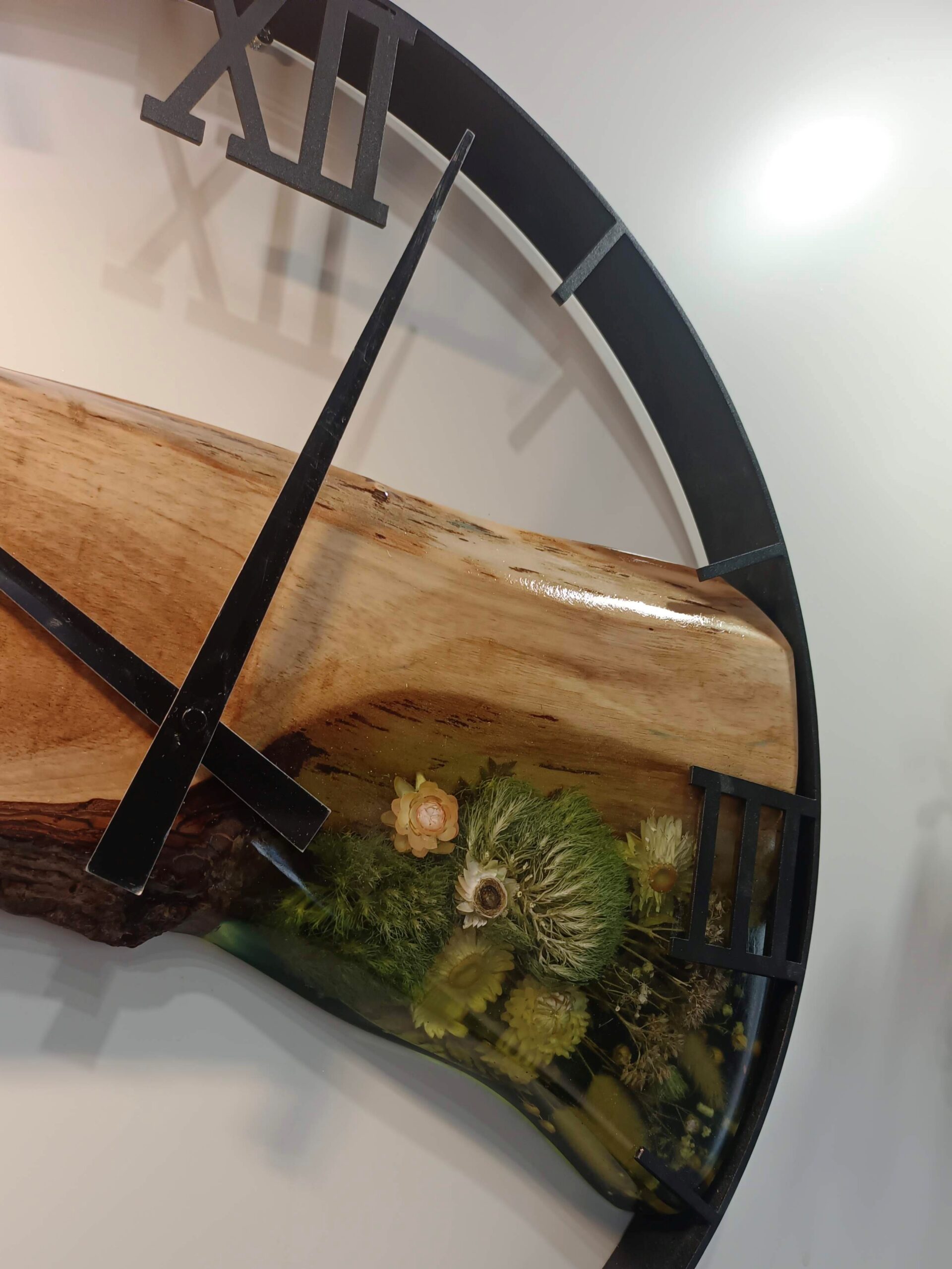Głównym bohaterem jest tu monolityczny fragment drewna orzechowego o unikatowym, głębokim rysunku słojów i naturalnym krawędziowaniu. Drewno zdaje się „płynąć” przez środek zegara, a jego linia zostaje uzupełniona przez transparentną żywicę, w której uwięziłam gęstą, leśną kompozycję. Znajdziesz w niej soczyście zielony mech chrobotek, delikatne suszki i rośliny leśne, które tworzą efekt mikroświata zatrzymanego w czasie.