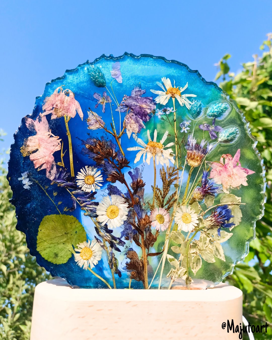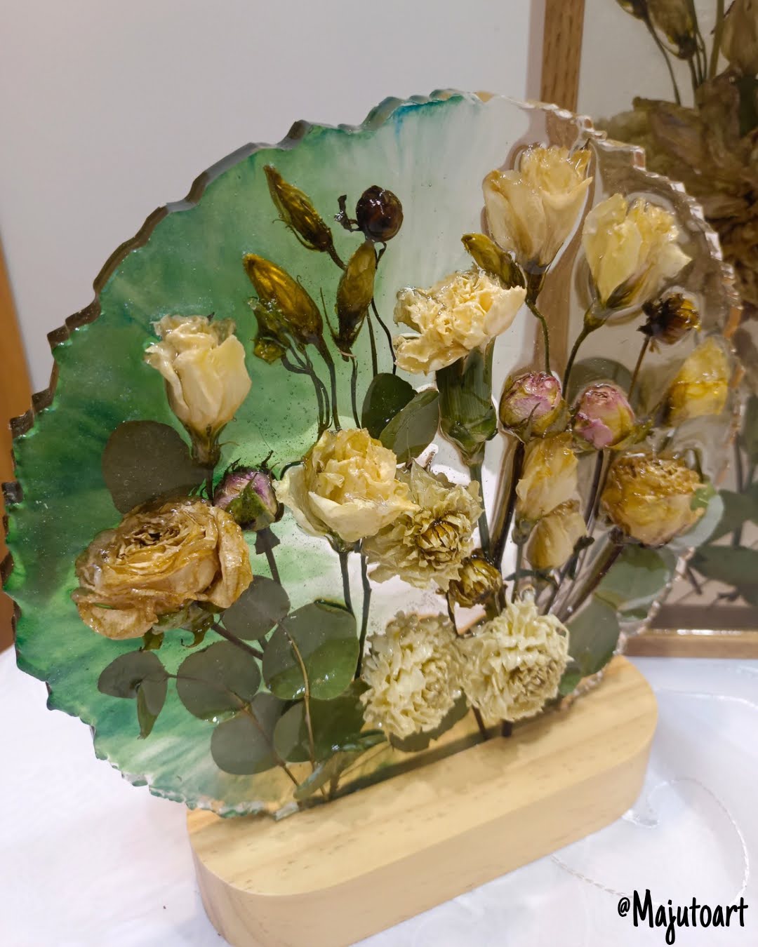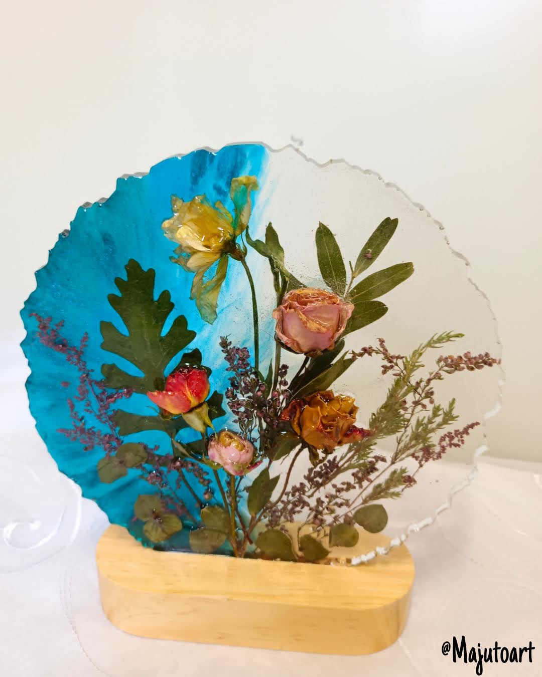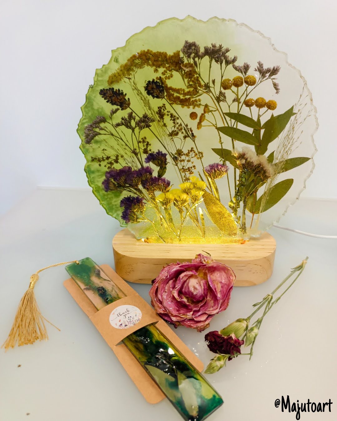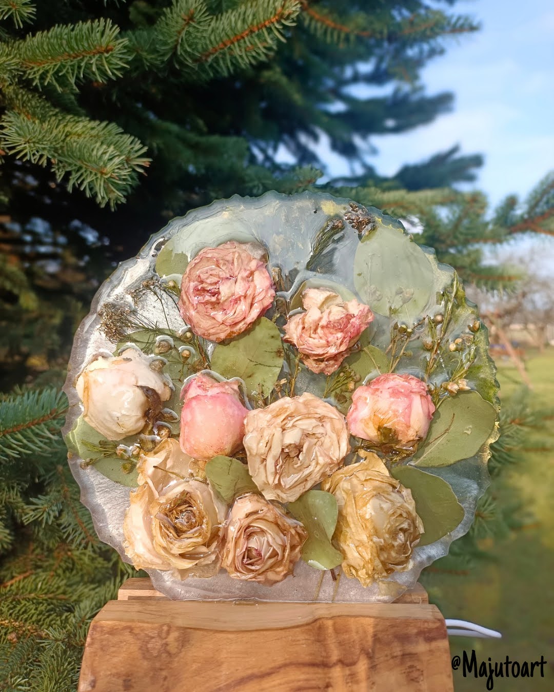 Delikatna i subtelna kompozycja z drobnych kwiatów, suszonych na płasko lub z lekko wystającymi elementami 3D. Całość osadzona na eleganckiej drewnianej podstawie z podświetleniem LED (USB). Idealna na szafkę nocną.
