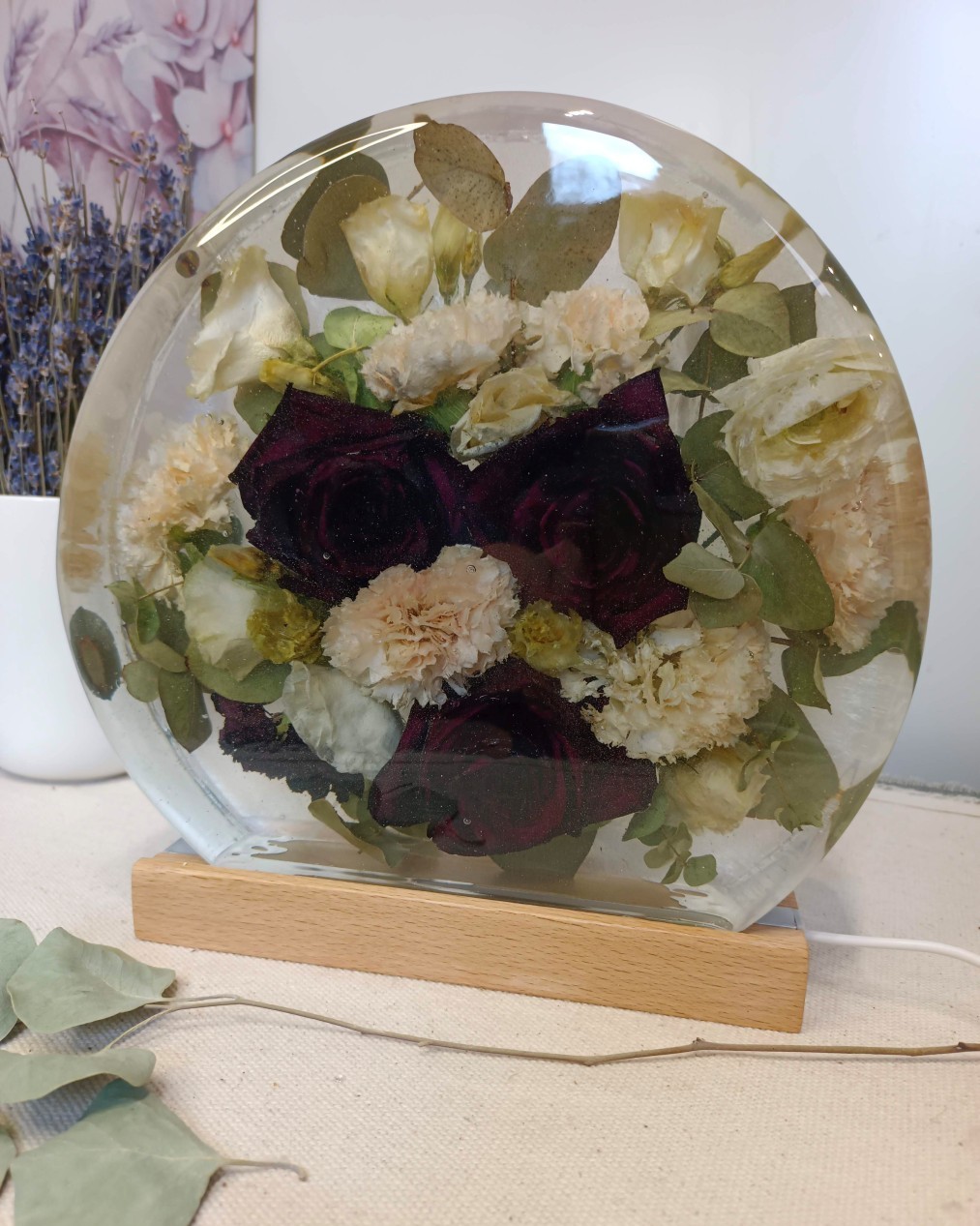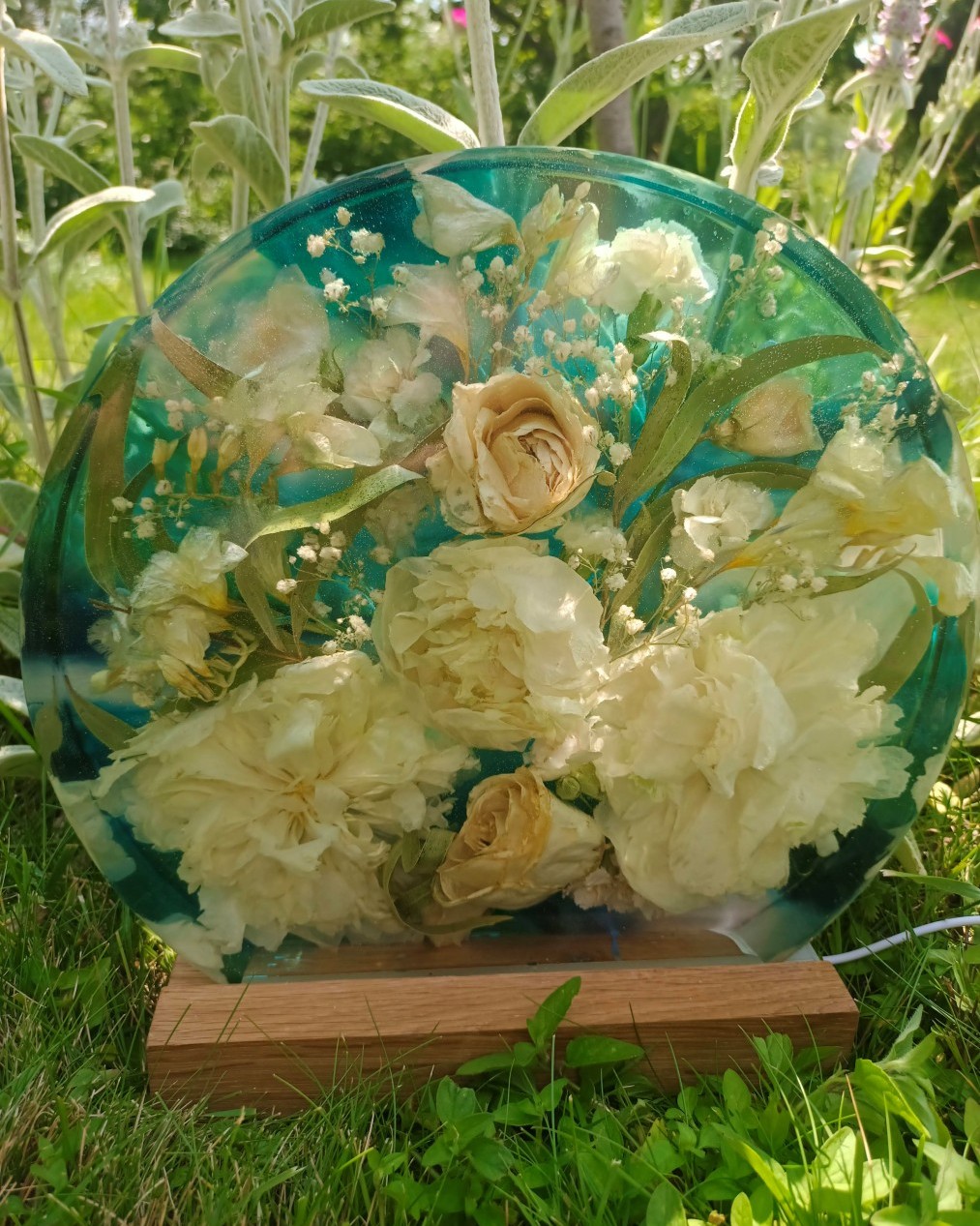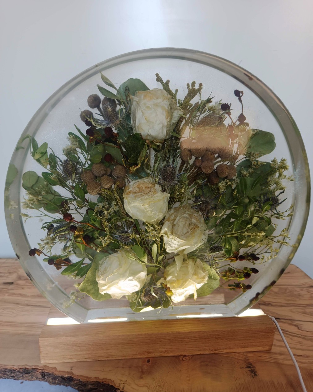 Monumentalna bryła o średnicy 25 cm, stworzona, by pomieścić większe fragmenty bukietu. Głęboka forma pozwala na zachowanie naturalnego kształtu róż czy piwonii. Zasilana kablem USB.