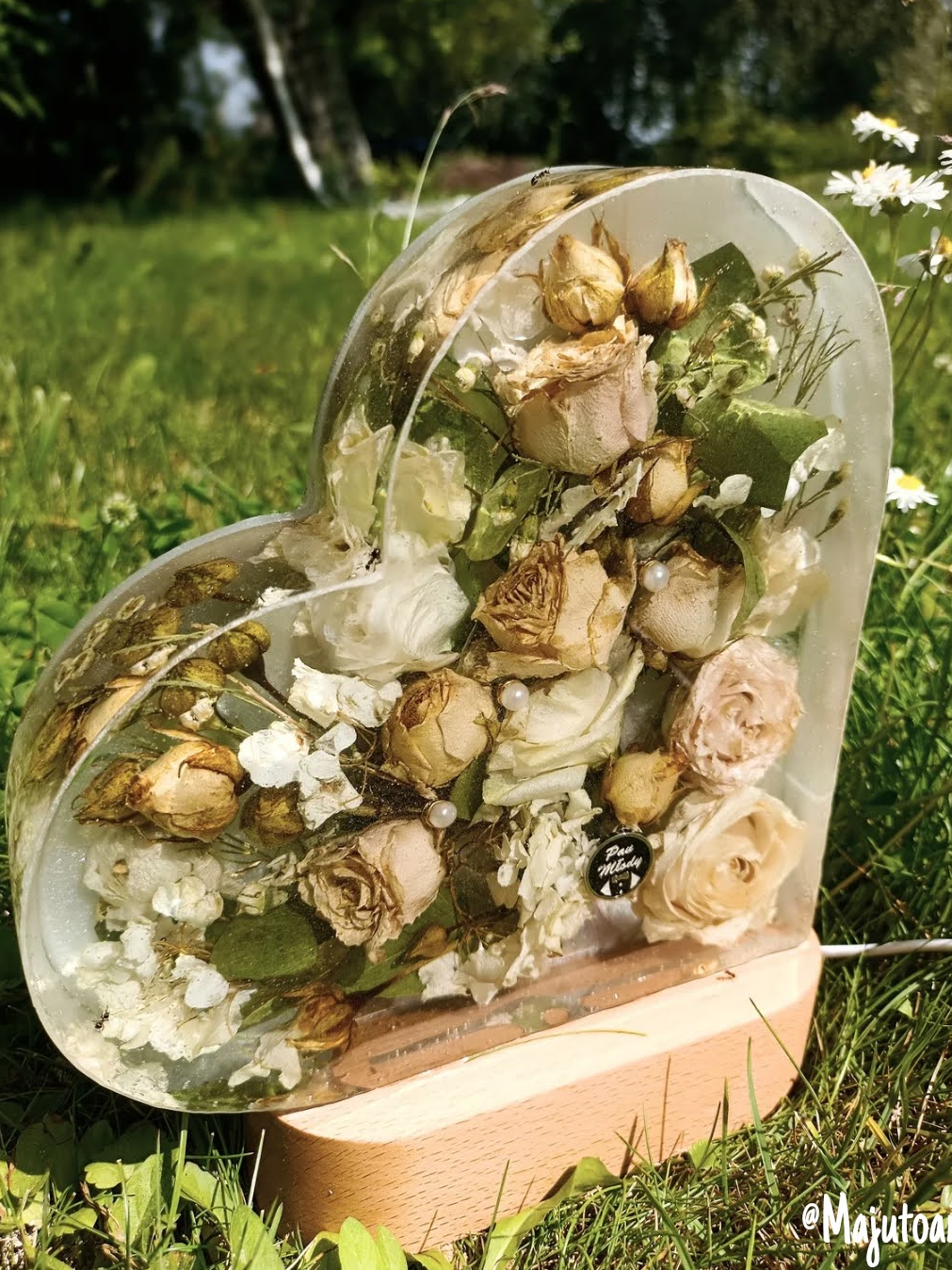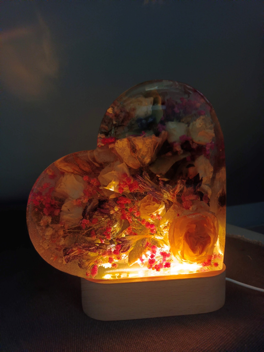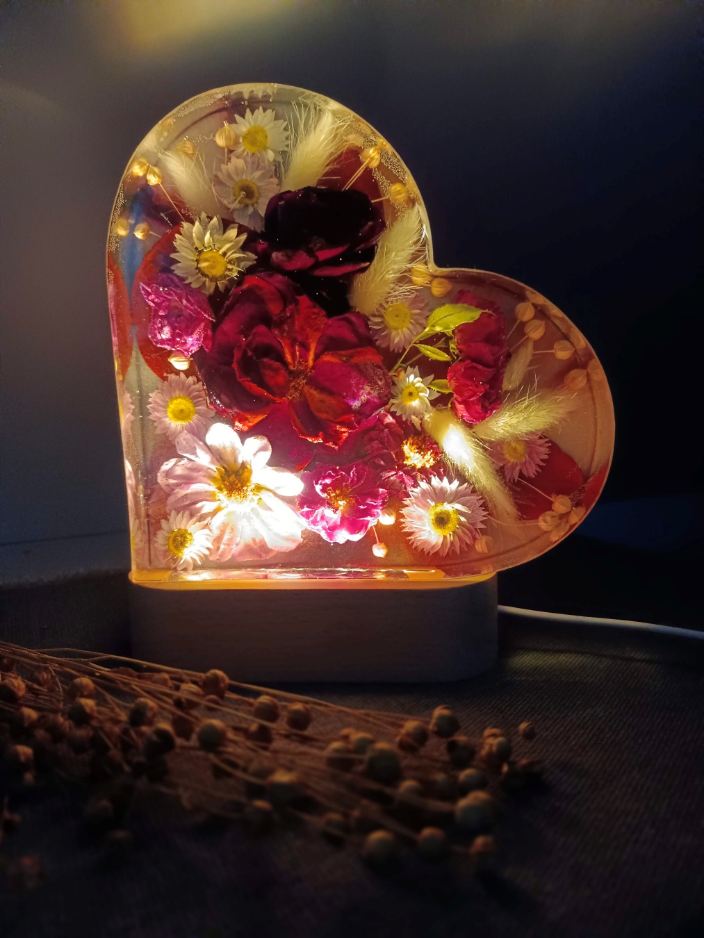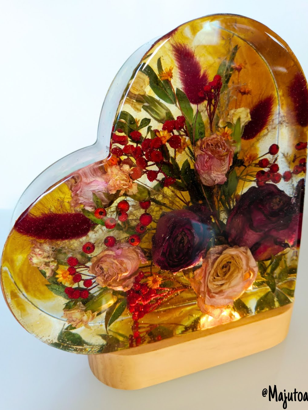 Romantyczna, głęboka forma, w której zamykamy kwiaty przestrzenne. Symbol Waszej miłości o wysokości 20 cm, podświetlony bazą LED (USB).
