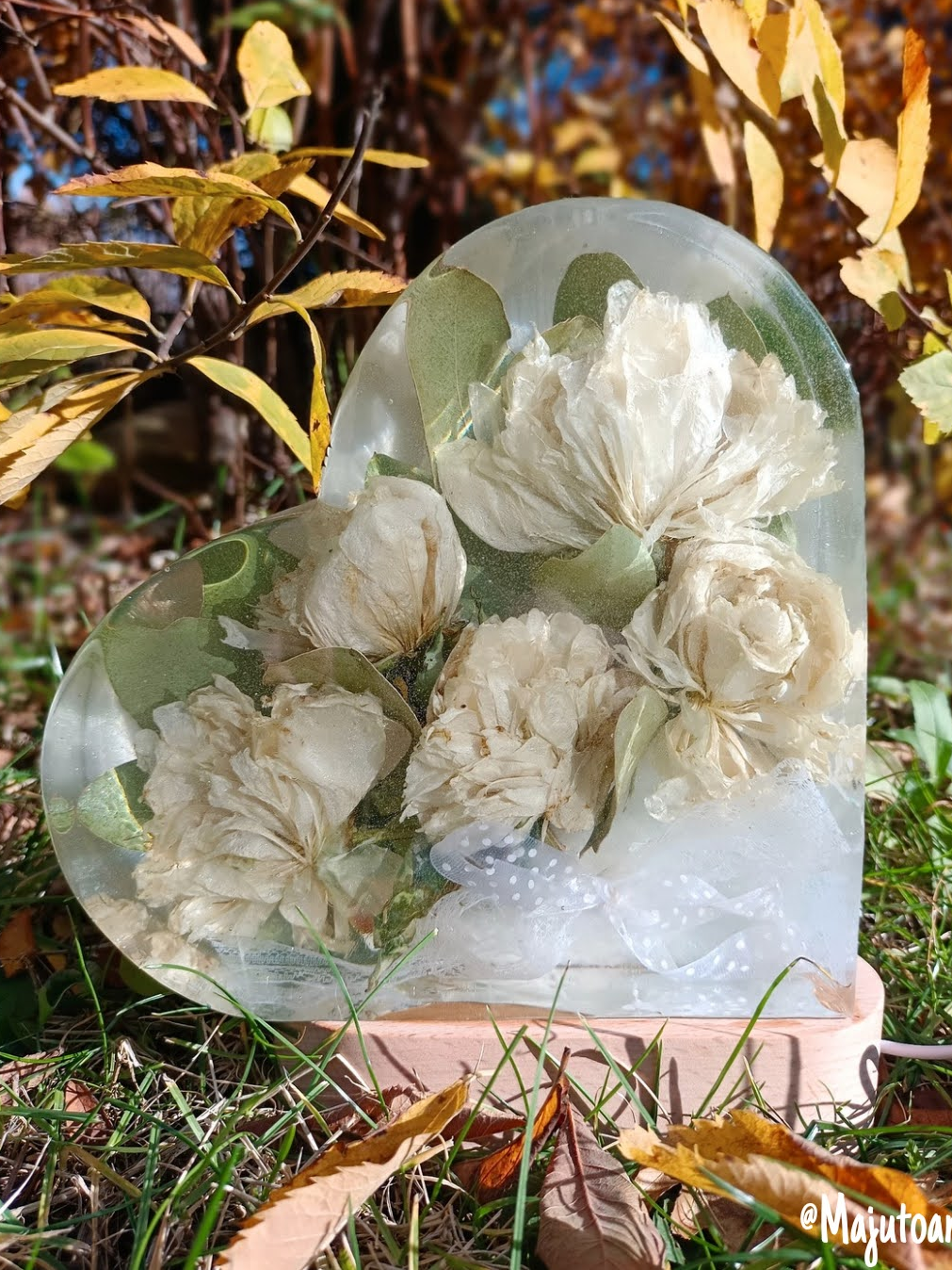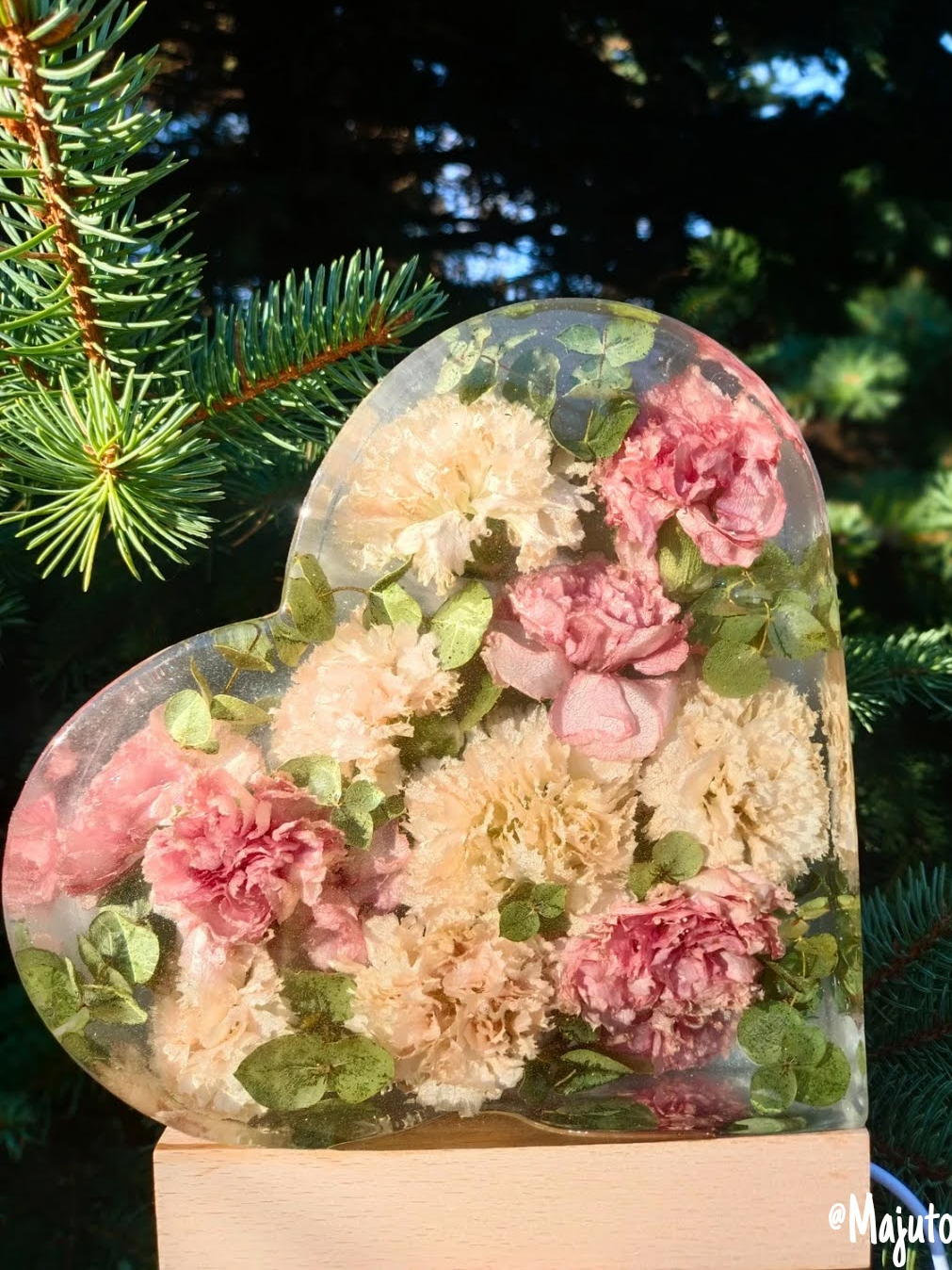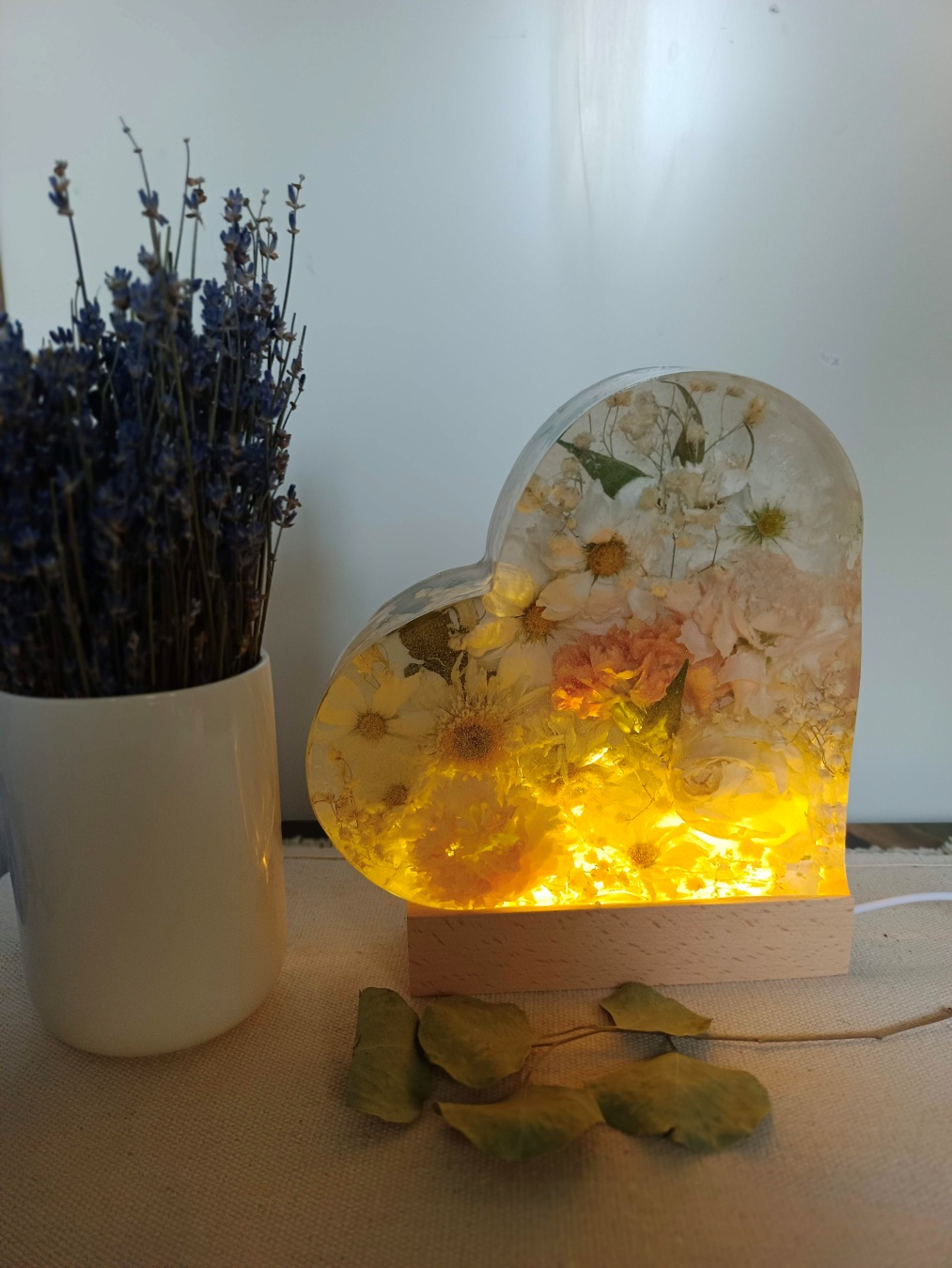 Romantyczna, głęboka forma, w której zamykamy kwiaty przestrzenne. Symbol Waszej miłości o wysokości 20 cm, podświetlony bazą LED (USB).