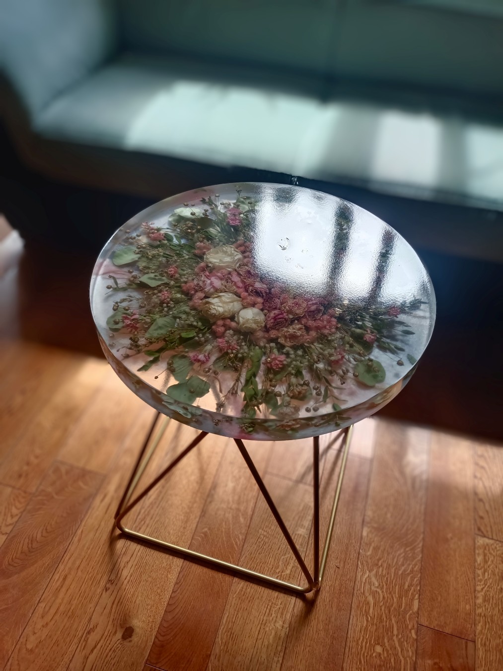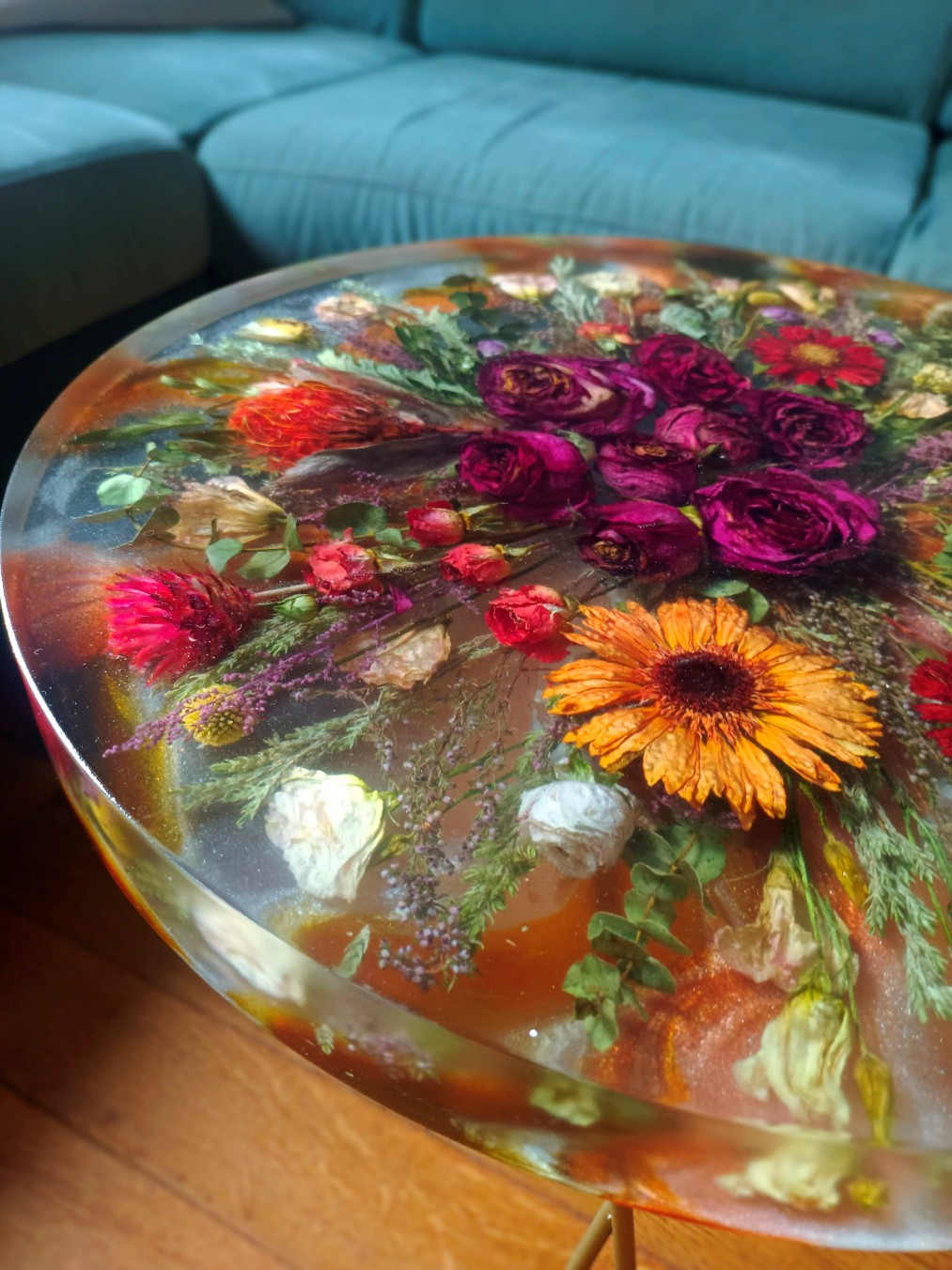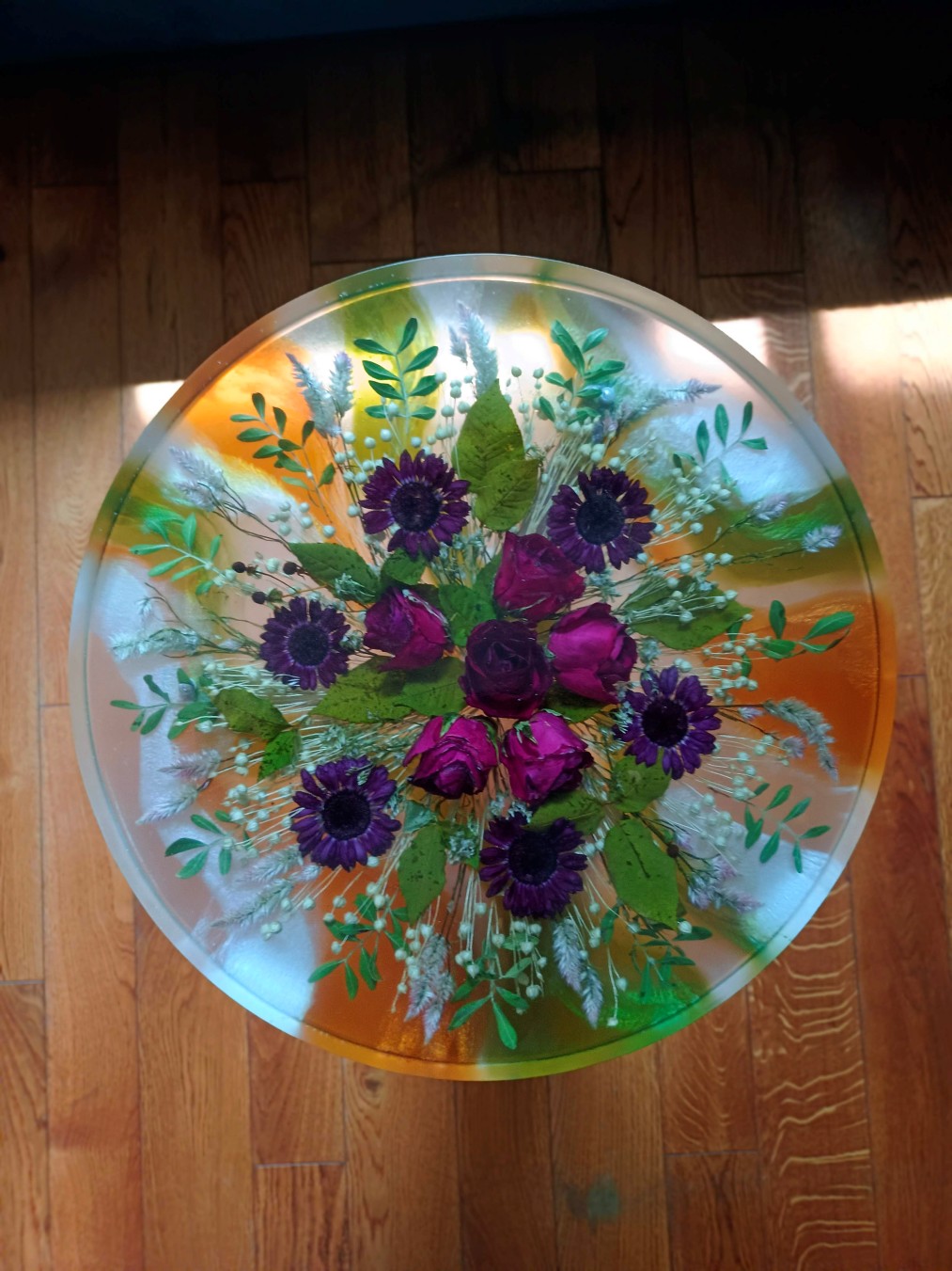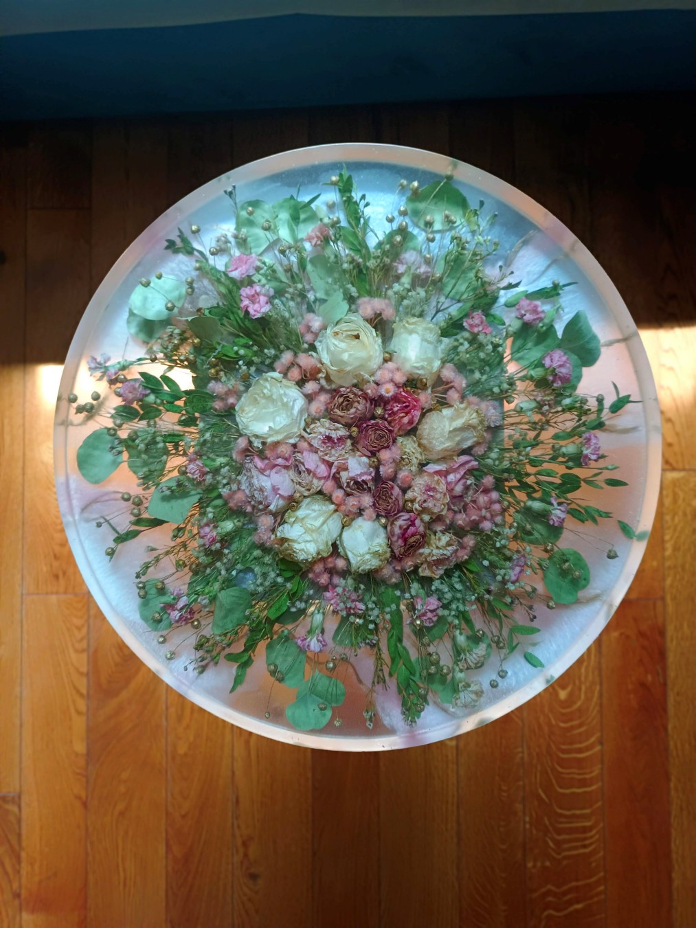Pełny blat z żywicy z zatopioną kompozycją kwiatową.