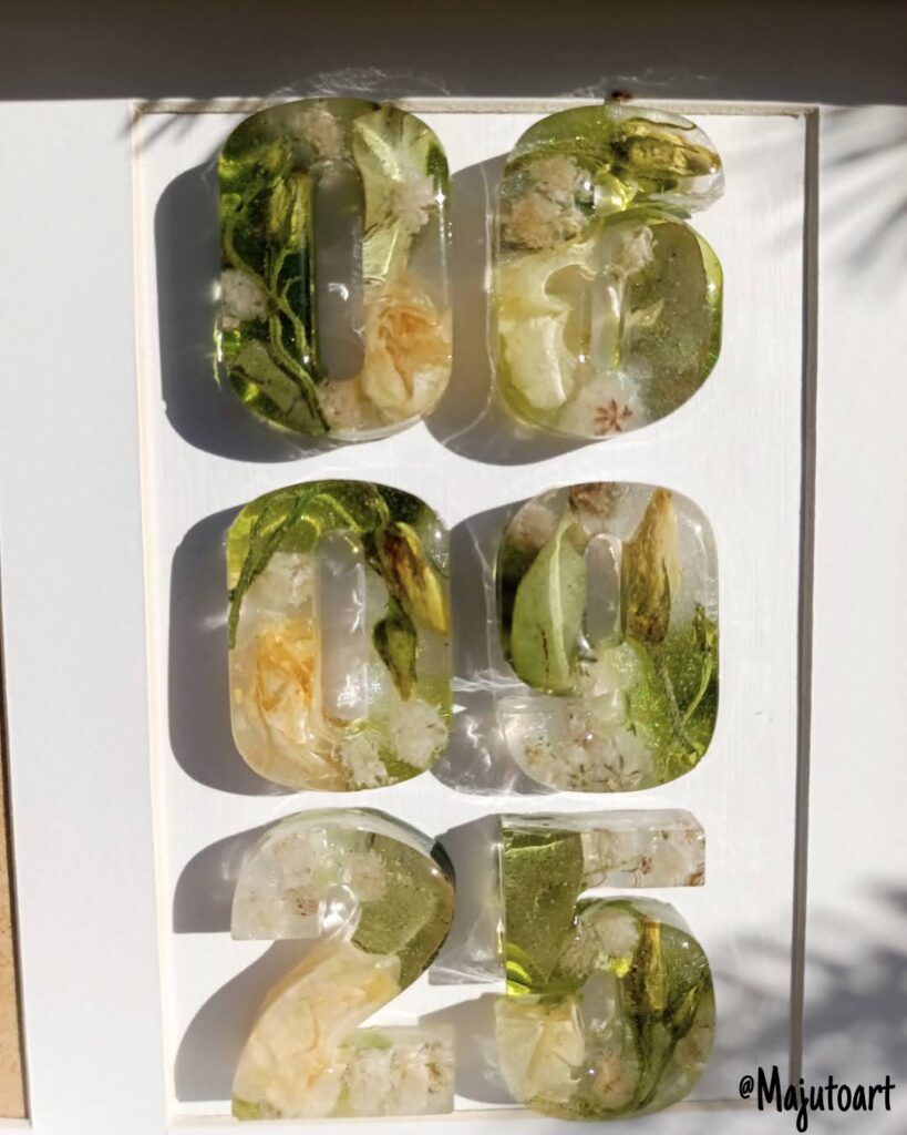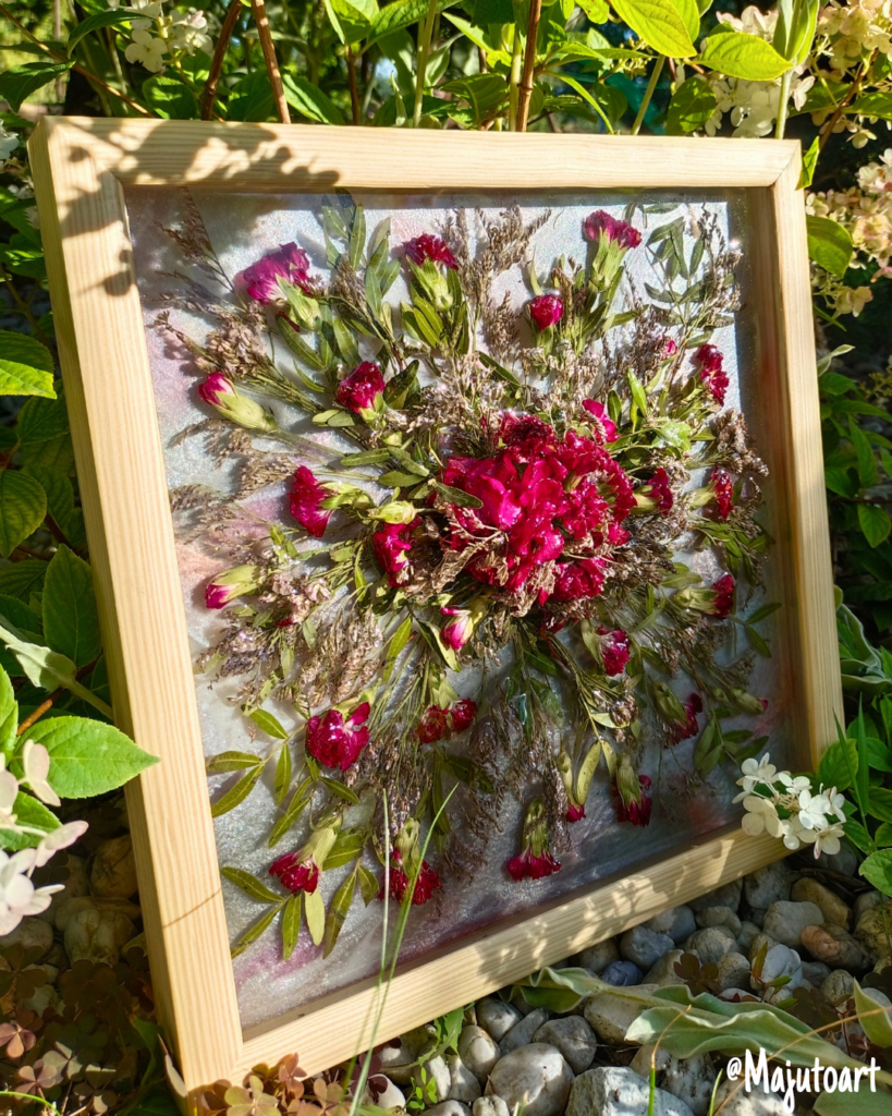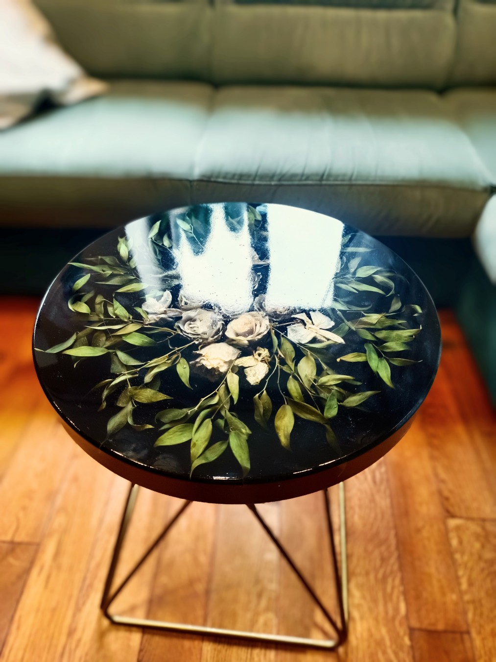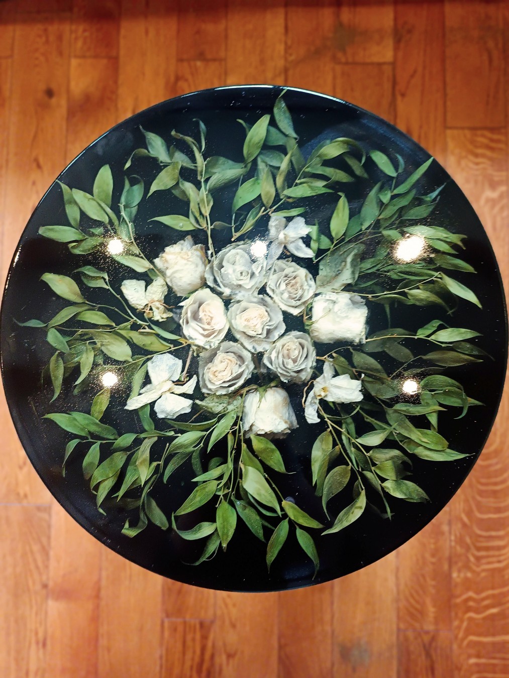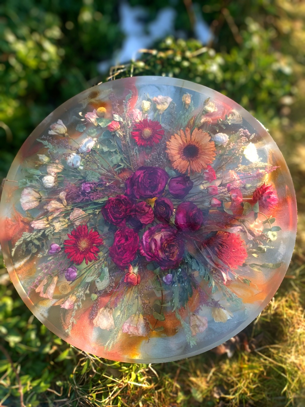 Pełny blat z żywicy z zatopioną kompozycją kwiatową.
