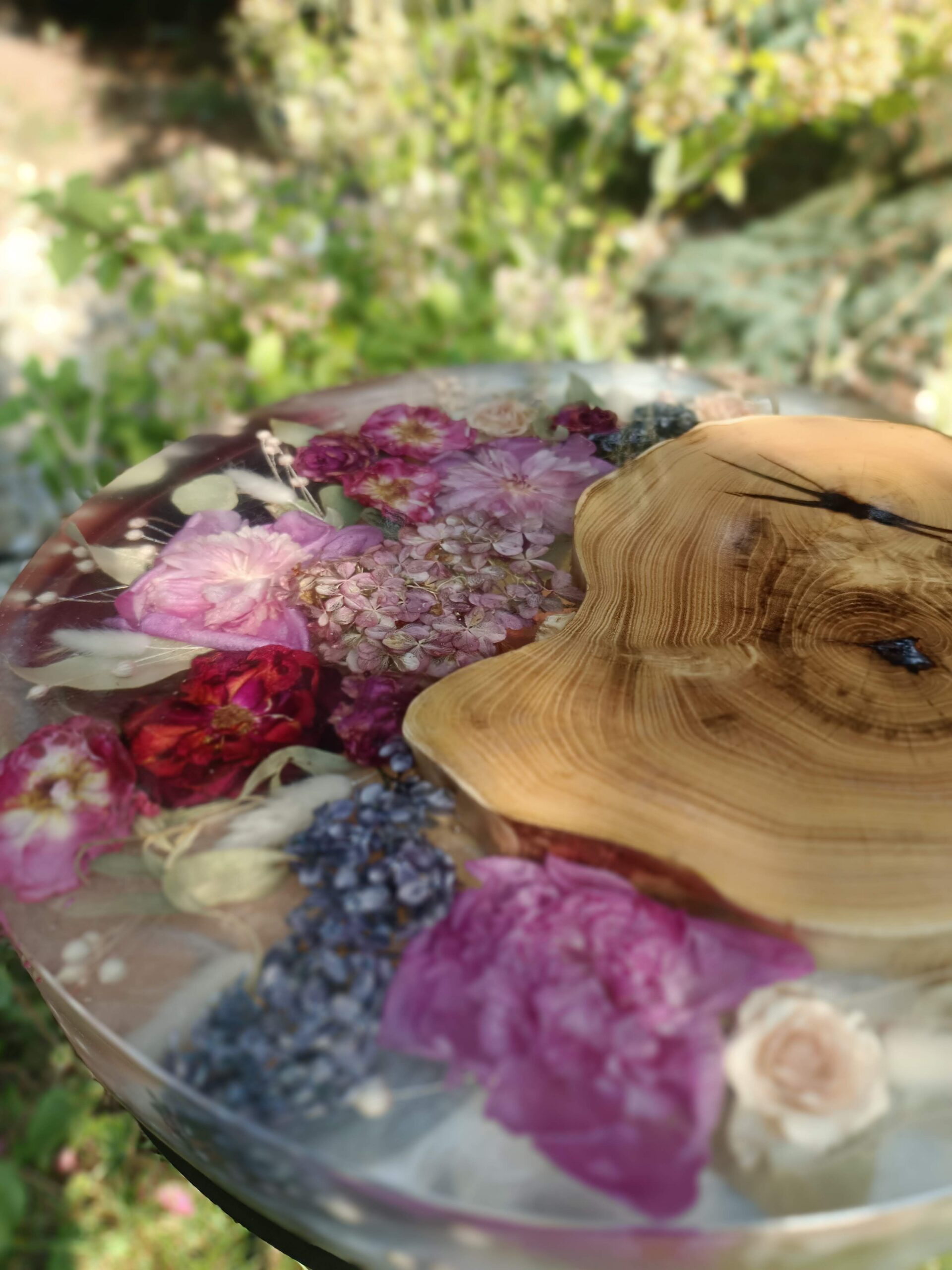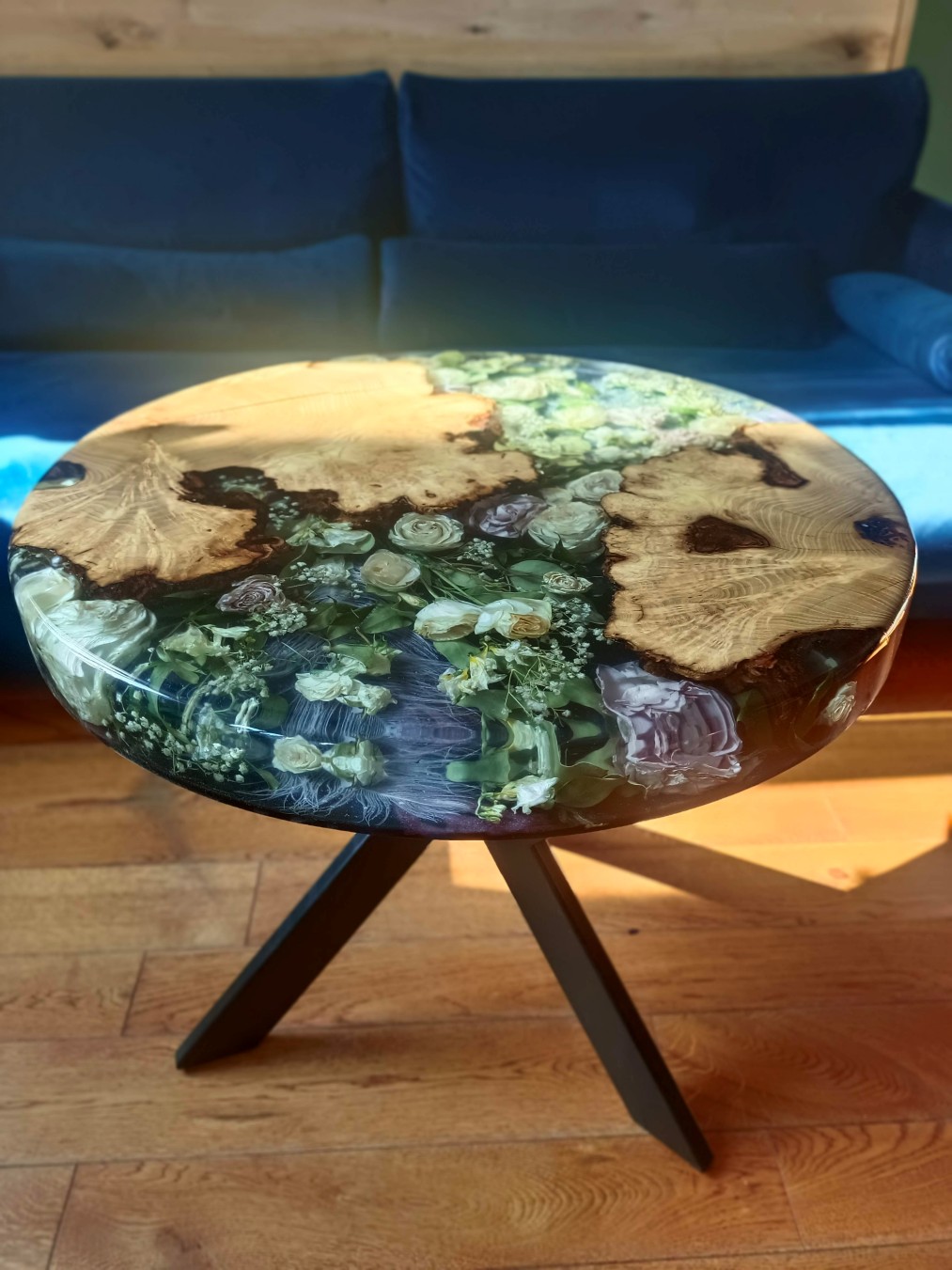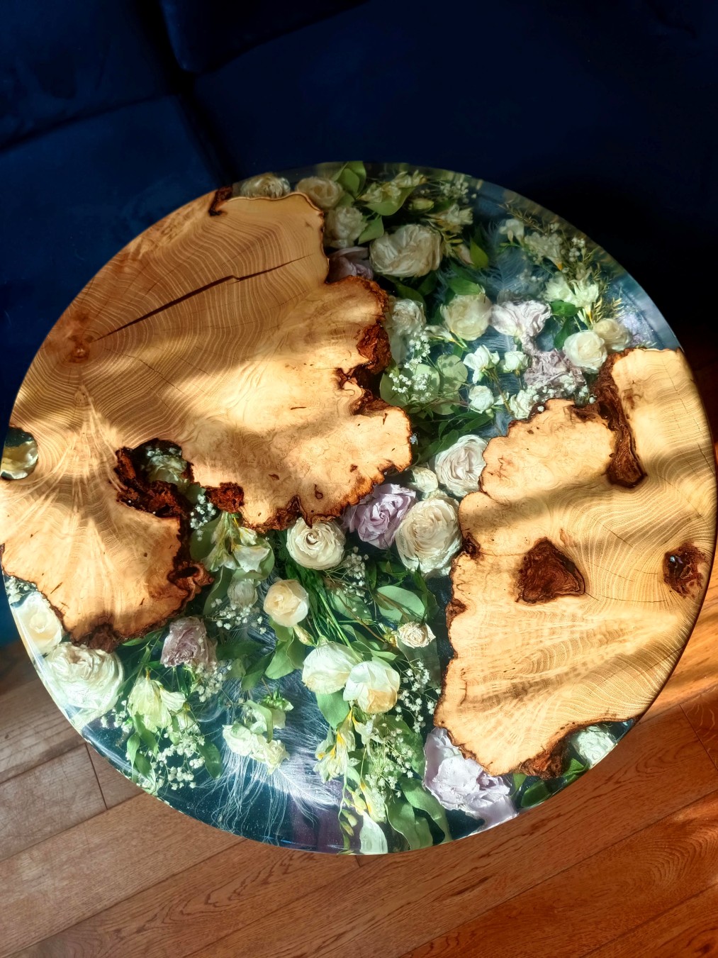 Połączenie drewna i żywicy z florystycznym akcentem.