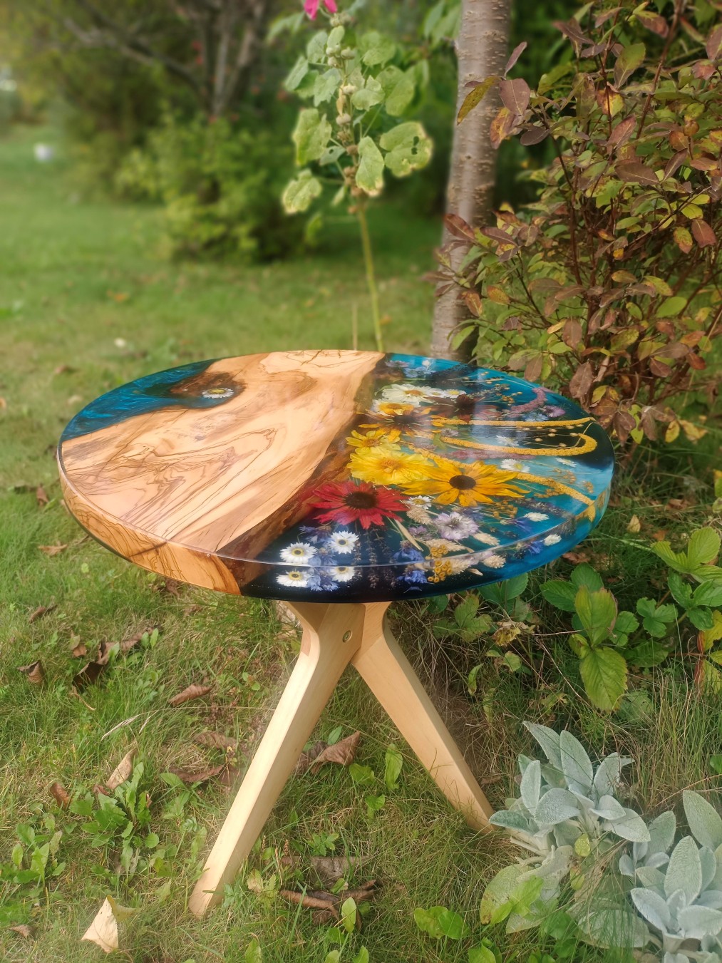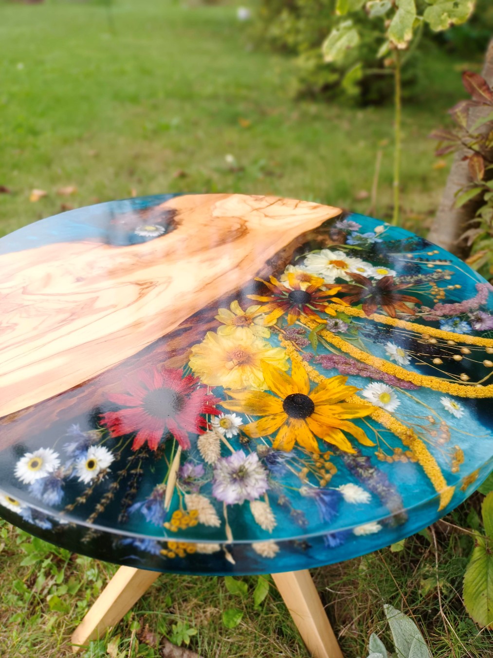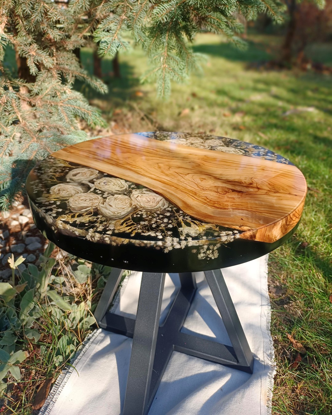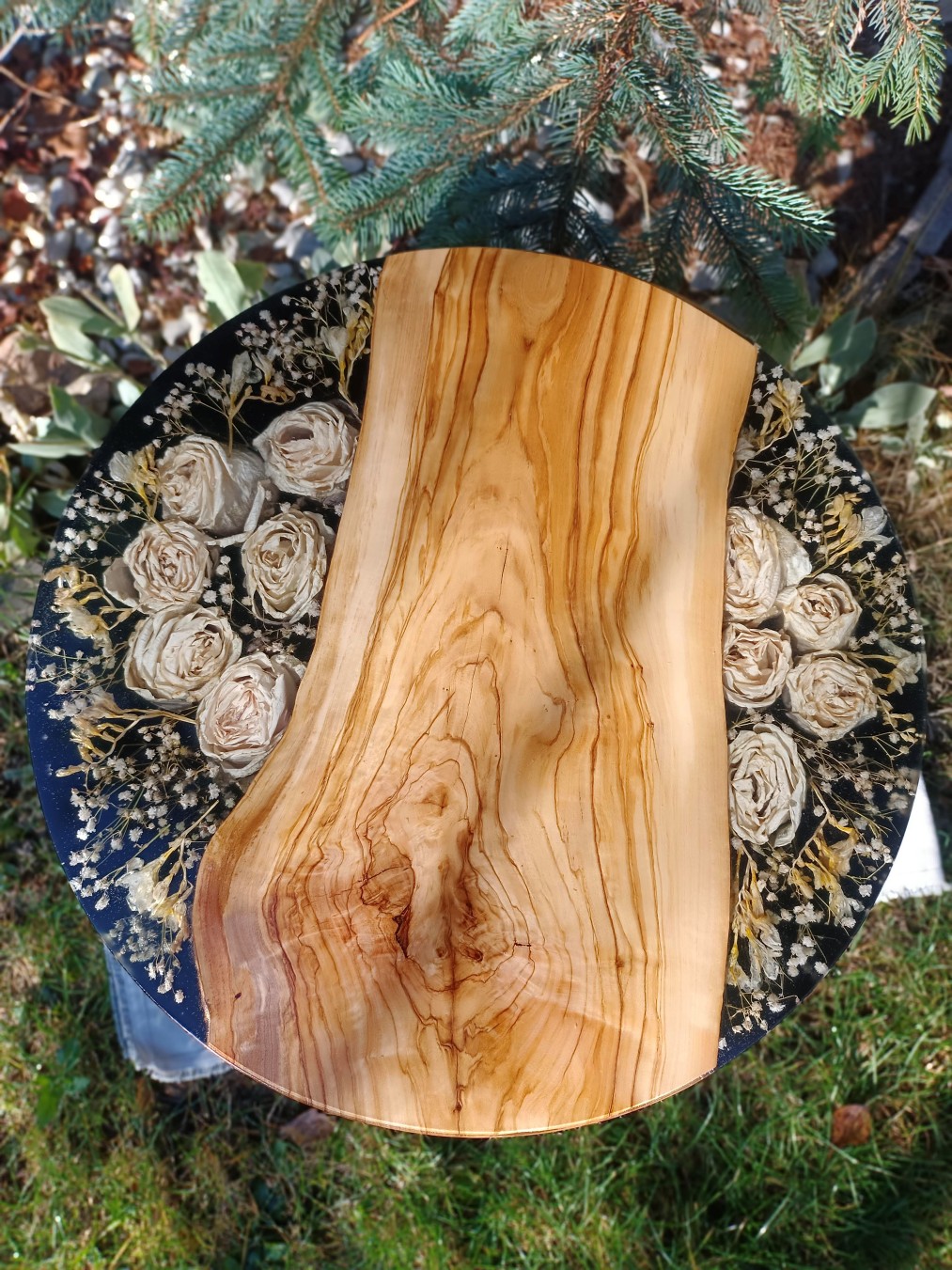 Połączenie drewna i żywicy z florystycznym akcentem.