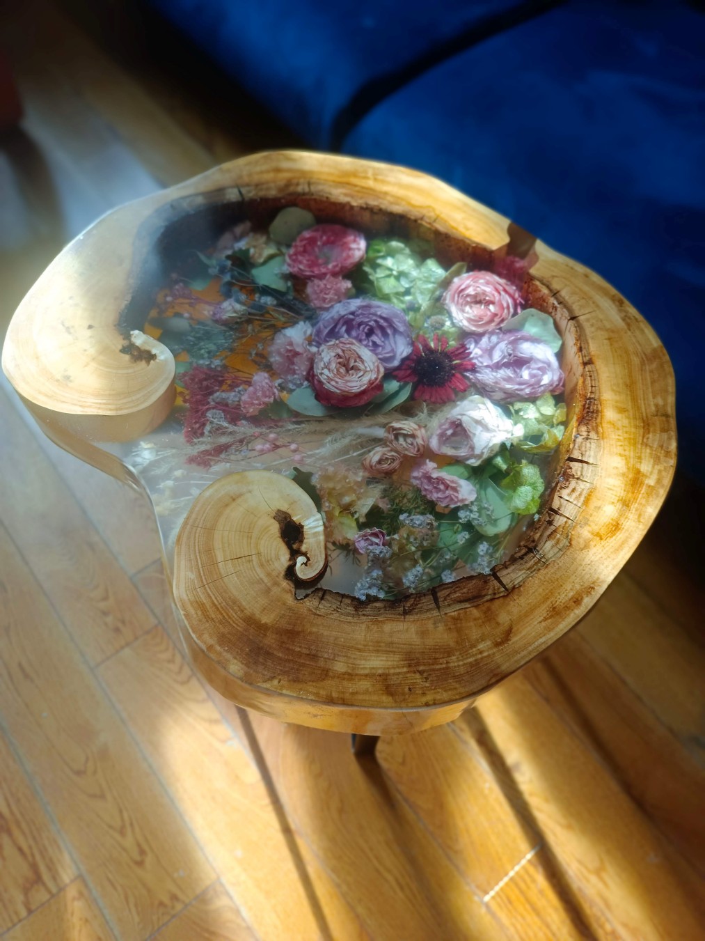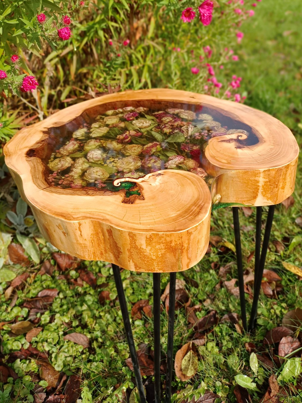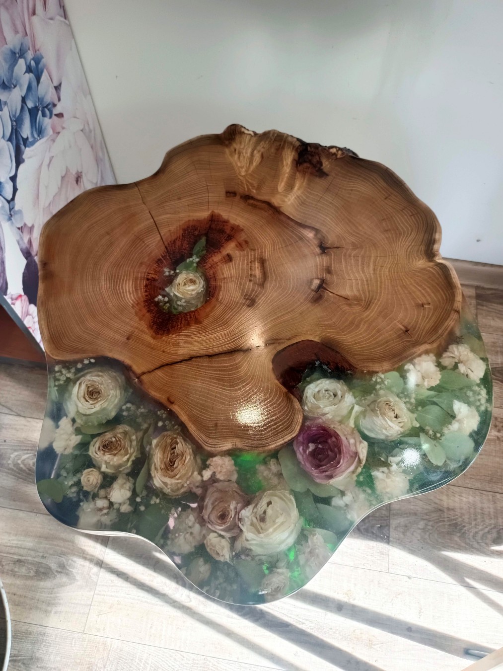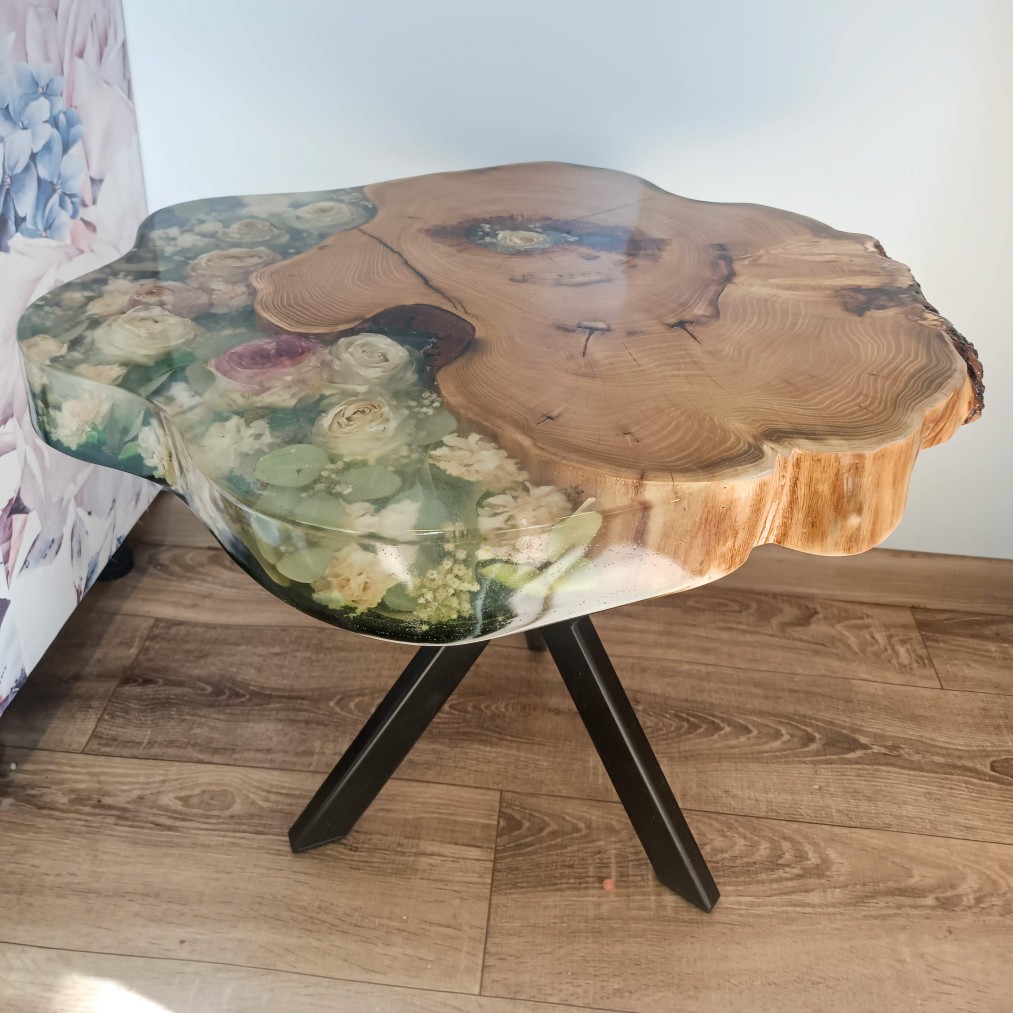 Stolik w plastrze drewna (Natural Edge) – kwiaty umieszczone w naturalnych pęknięciach lub wewnątrz otworu w środku plastra.