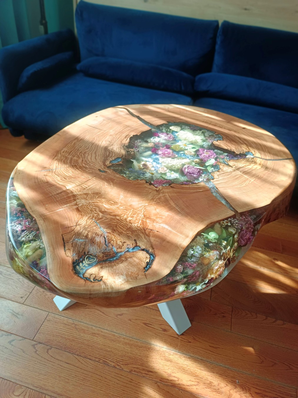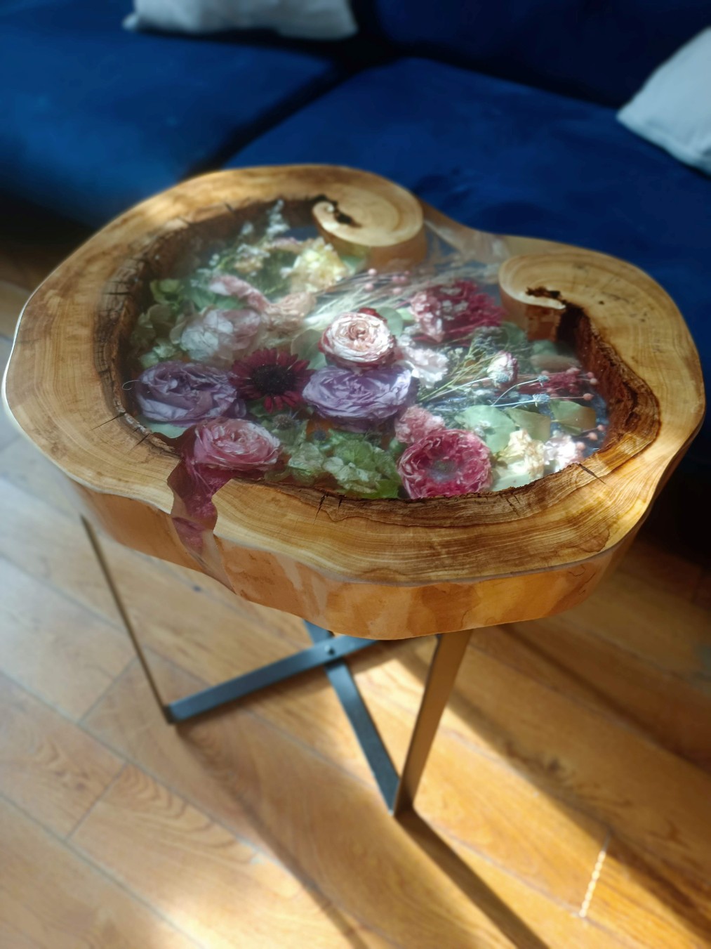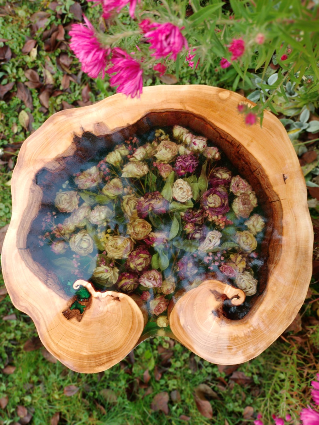 Stolik w plastrze drewna (Natural Edge) – kwiaty umieszczone w naturalnych pęknięciach lub wewnątrz otworu w środku plastra.
