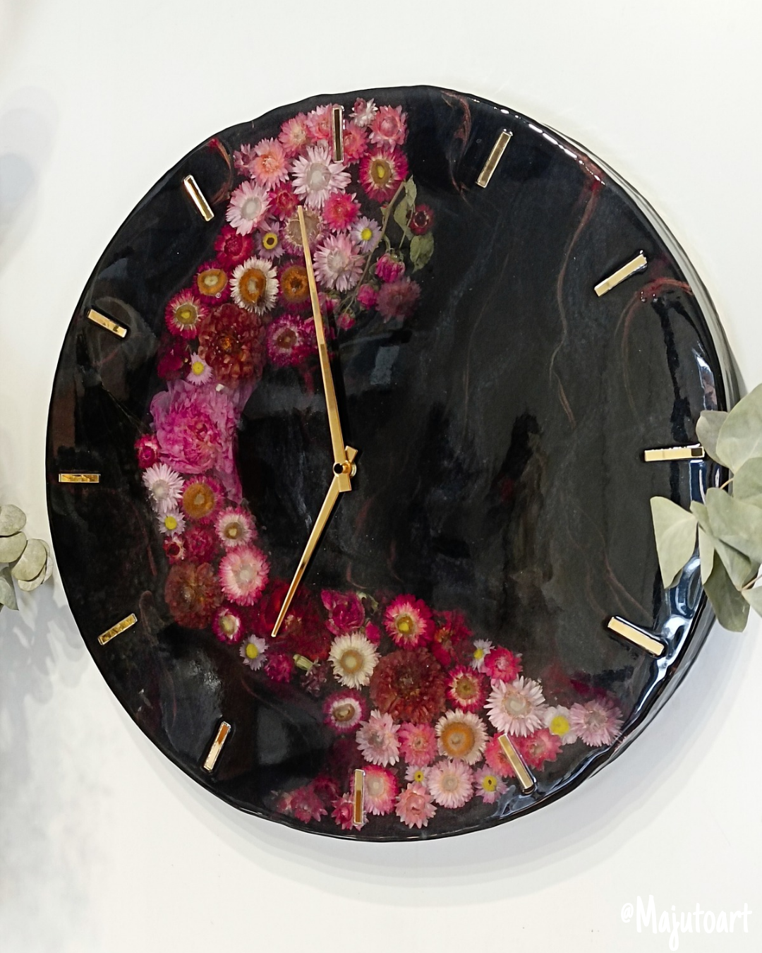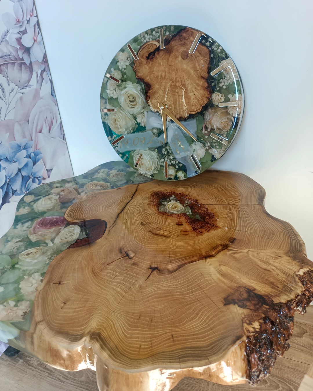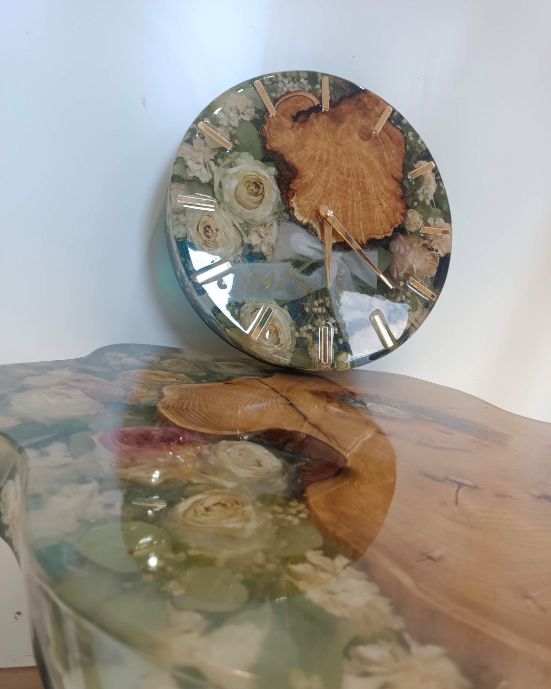 Czas płynie, ale kwiaty nie więdną. Unikatowy zegar (z samej żywicy lub z dodatkiem drewna) z lustrzanymi cyframi w kolorze złota lub srebra.