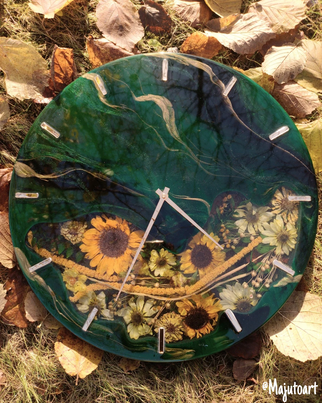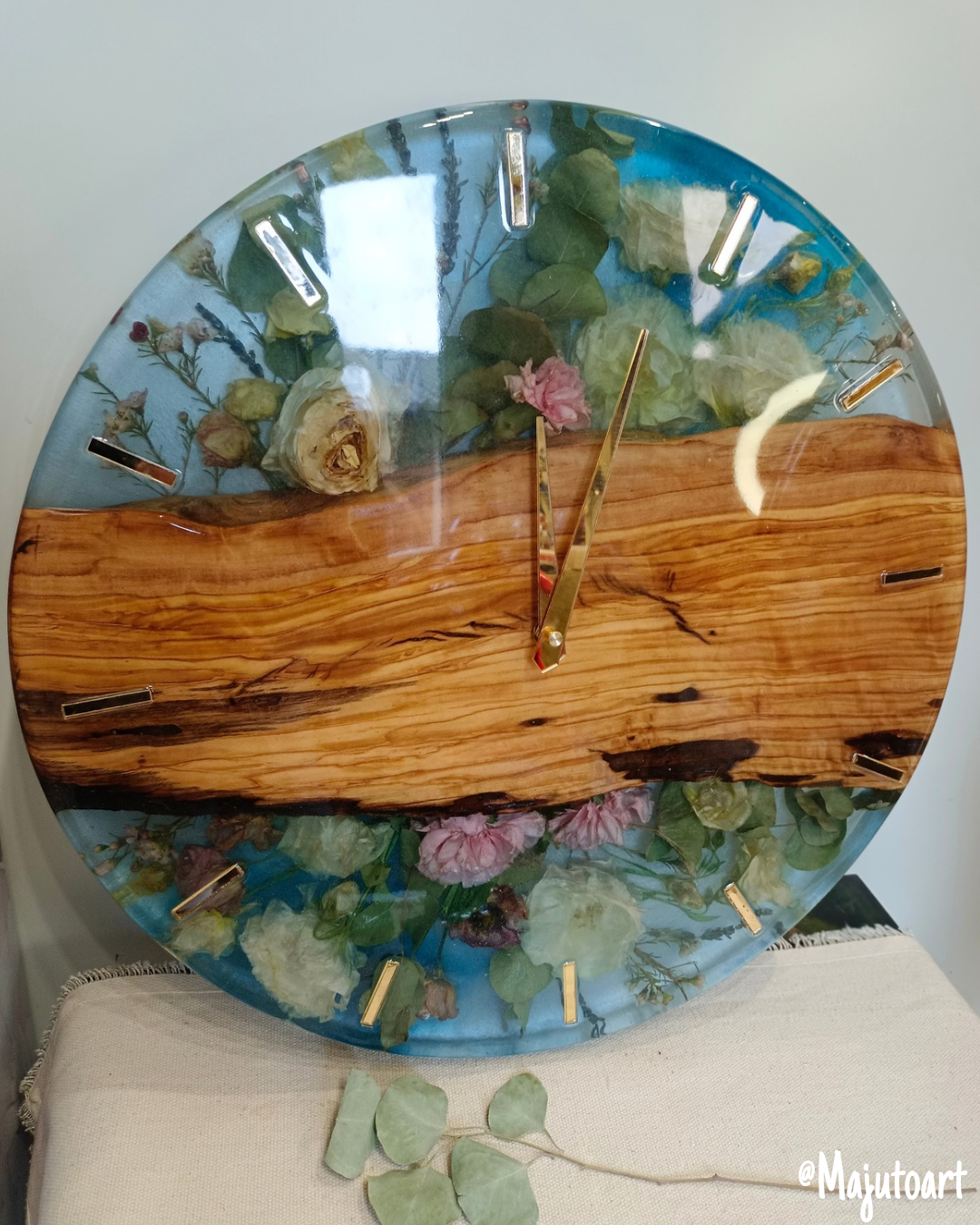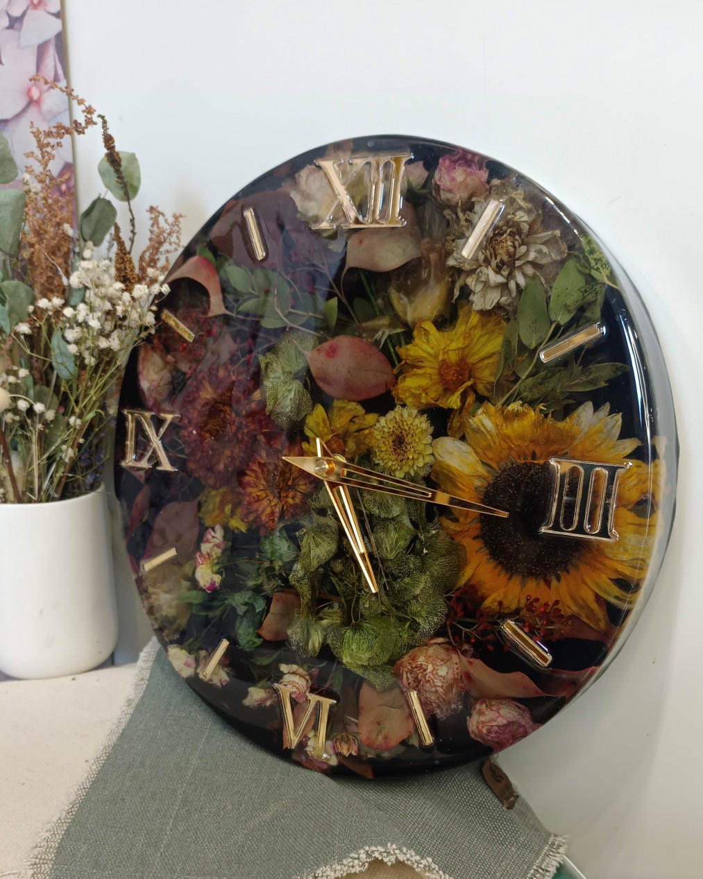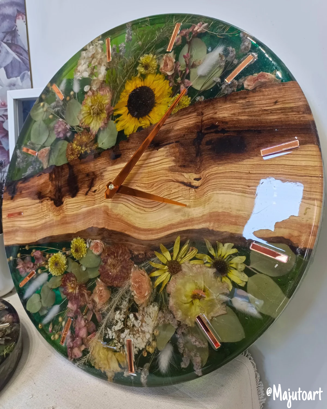 Czas płynie, ale kwiaty nie więdną. Unikatowy zegar (z samej żywicy lub z dodatkiem drewna) z lustrzanymi cyframi w kolorze złota lub srebra.